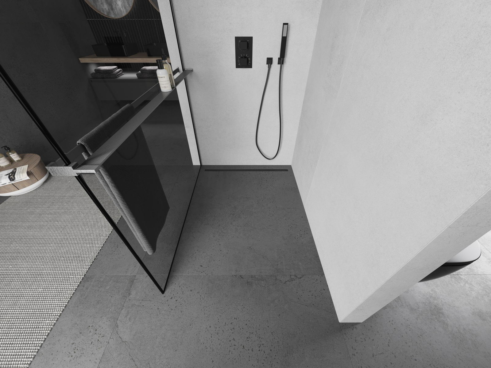 Mexen Kioto+ L parete doccia con mensola Walk-in 120 x 200 cm, cornice nera, grigio canna di fucile spazzolato