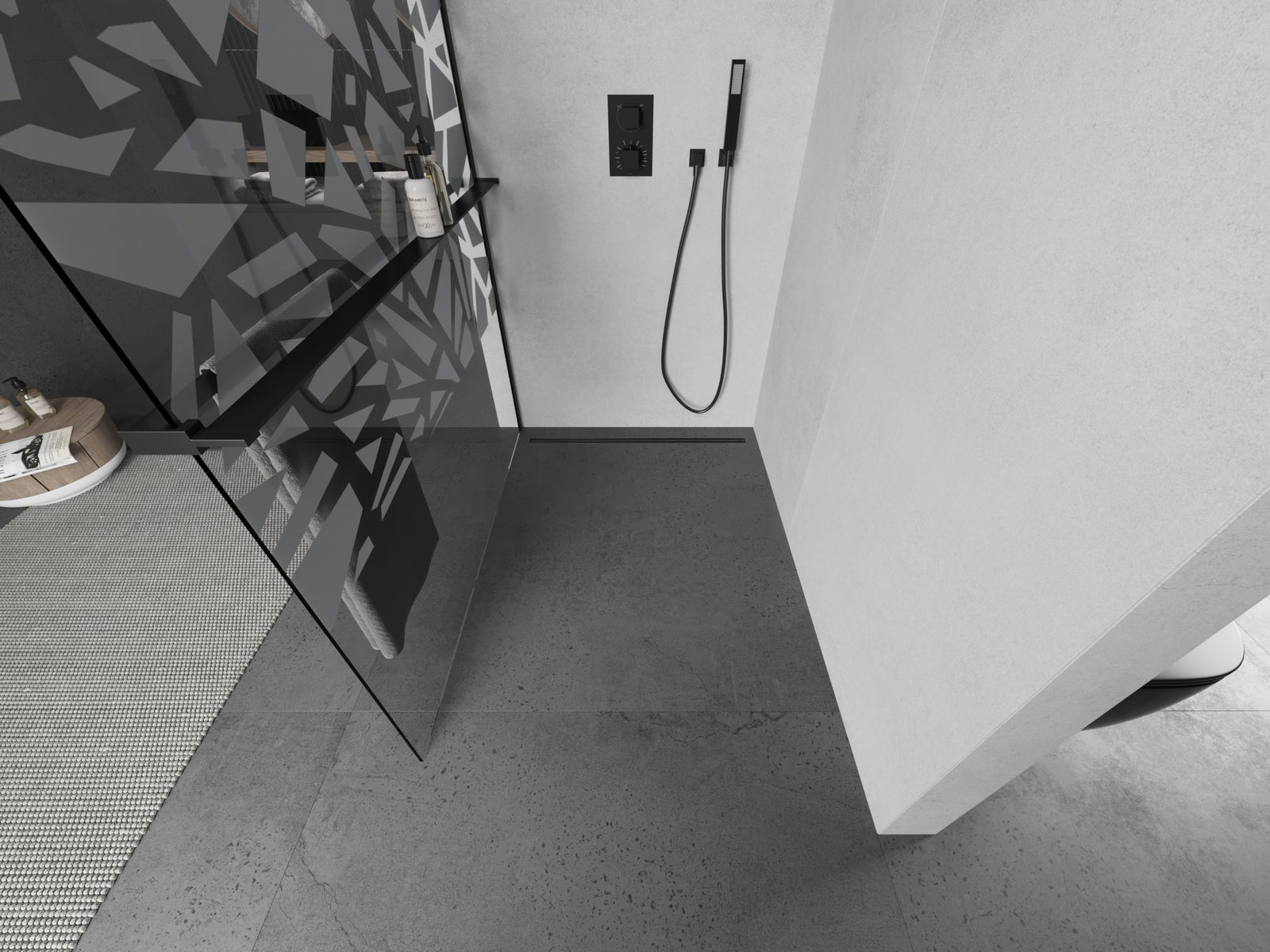 Mexen Kioto+ L parete doccia con mensola Walk-in 110 x 200 cm, motivo bianco, nero - 800-110-123-70-85