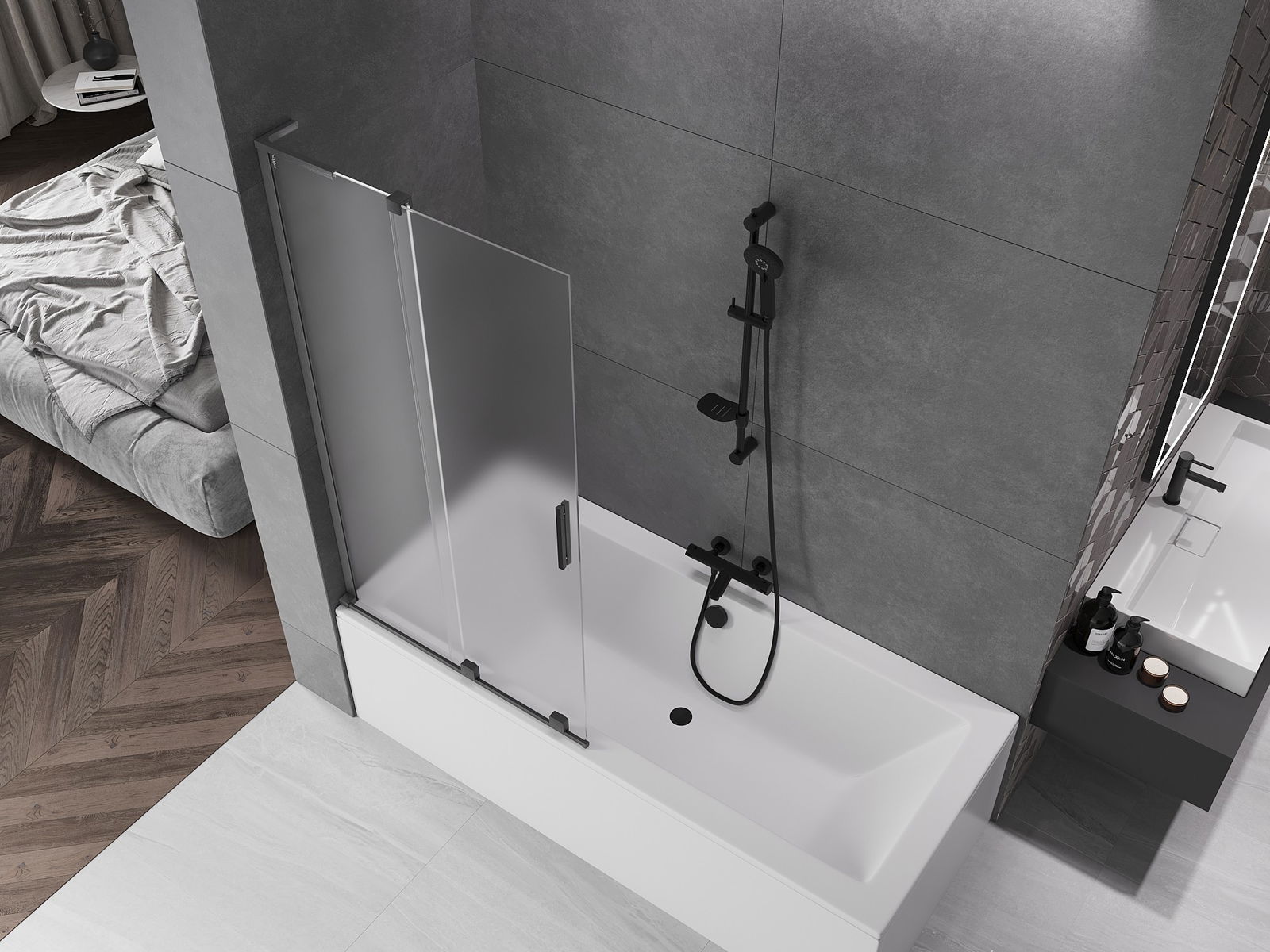 Mexen Velar L paravento per vasca da bagno a 2 ante scorrevoli 95 x 150 cm, brina, grigio canna di fucile spazzolato