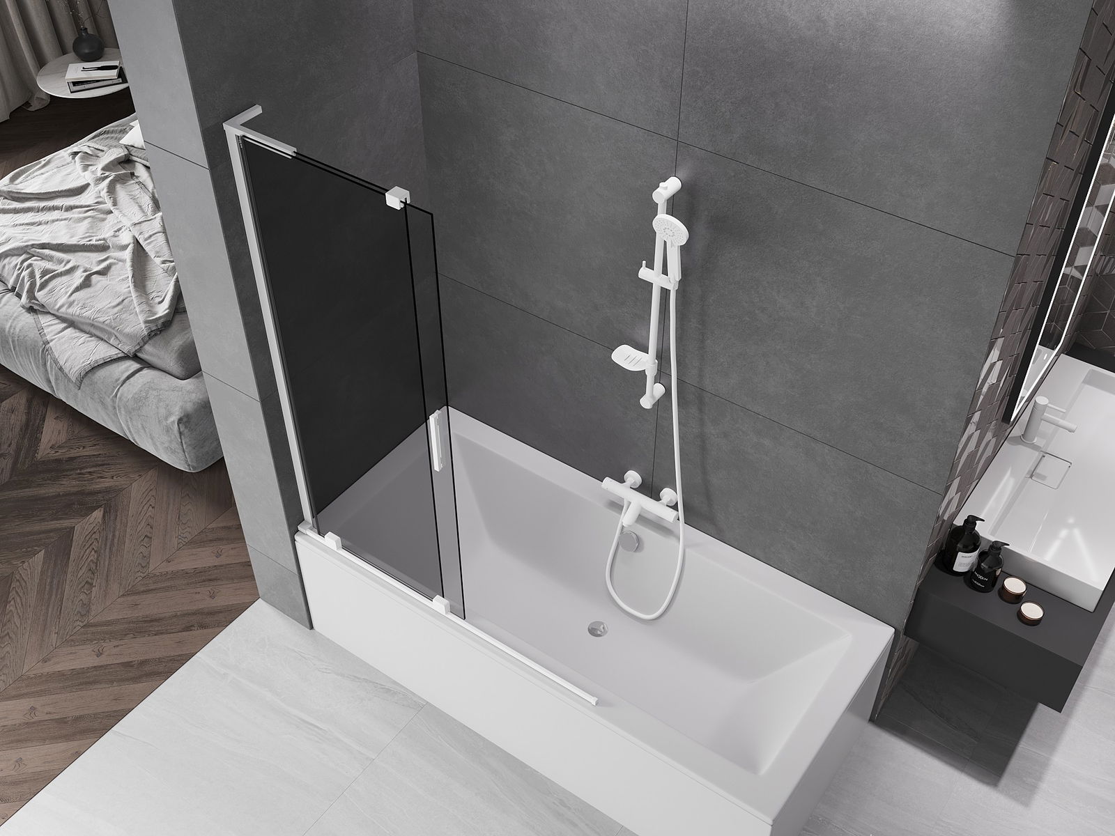 Mexen Velar L paratia da vasca da bagno 2 ante scorrevoli 120 x 150 cm, grafite, bianco - 896-120-003-41-20