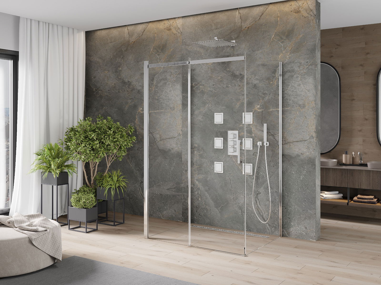 Il prodotto, a seconda delle esigenze, può essere installato sia sul piatto doccia che direttamente sul pavimento. Il metodo di installazione universale consente di adattare il prodotto a diversi tipi di bagni e configurazioni di spazio.