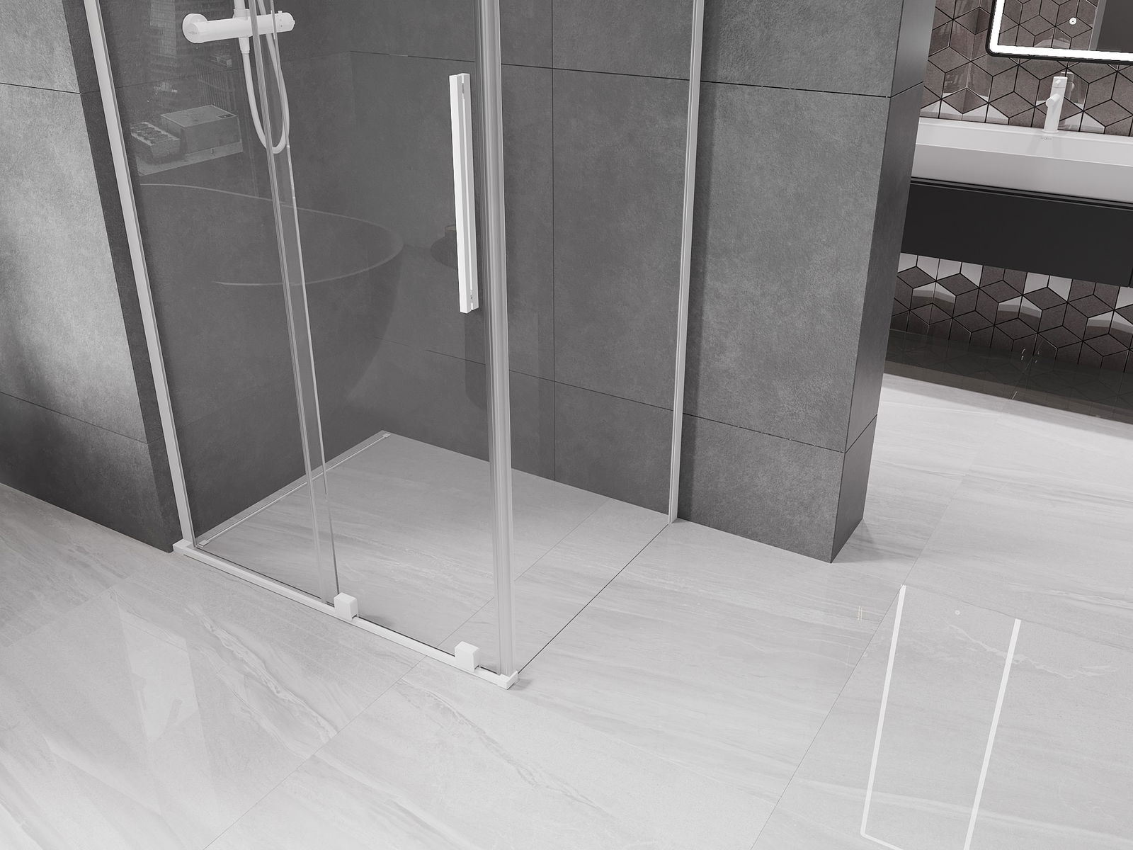 La comoda e pratica maniglia è realizzata in acciaio inossidabile. La forma alla moda unita alla finitura abbinata al colore dei profili conferisce all'intero un aspetto moderno e stiloso, evidenziando l'estetica di ogni bagno.
