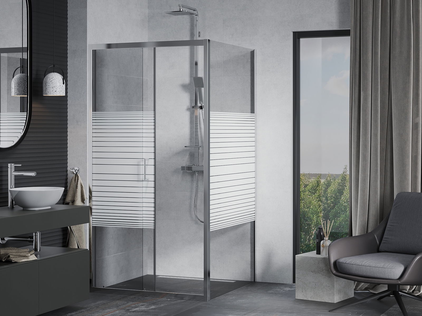 L'impugnatura pratica e comoda è realizzata in metallo durevole e resistente. La forma alla moda combinata con una finitura abbinata al colore dei profili conferisce all'insieme un aspetto moderno e elegante, enfatizzando l'estetica di ogni bagno.