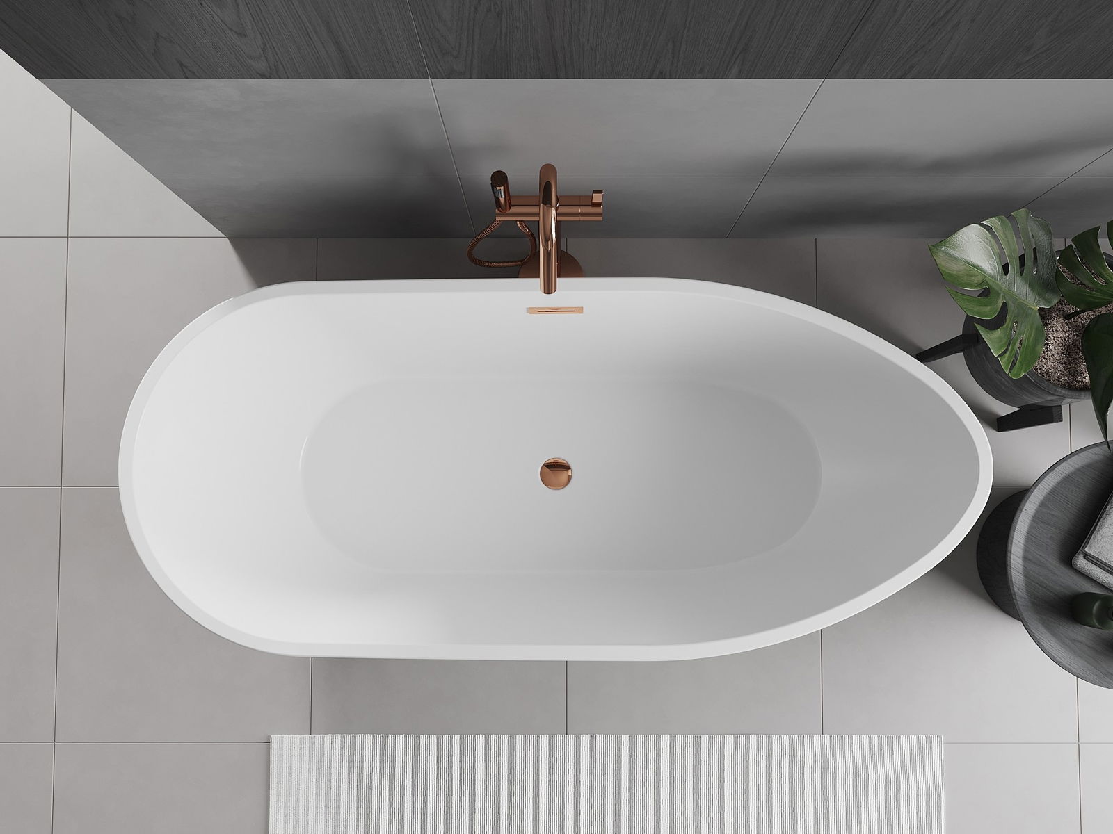 Mexen Eos è una vasca da bagno autoportante delle dimensioni di 170 x 75 cm, ideale per bagni moderni. Realizzata in acrilico sanitario, garantisce durata e facilità di pulizia. La forma ovale e il colore elegante bianco-nero si adattano perfettamente a qualsiasi stile. La finitura in oro rosa aggiunge un tocco di lusso. La vasca è dotata di troppo pieno e scarico centrale, aumentando il comfort d'uso. Inoltre, il set include sifone e tappo click-clack.