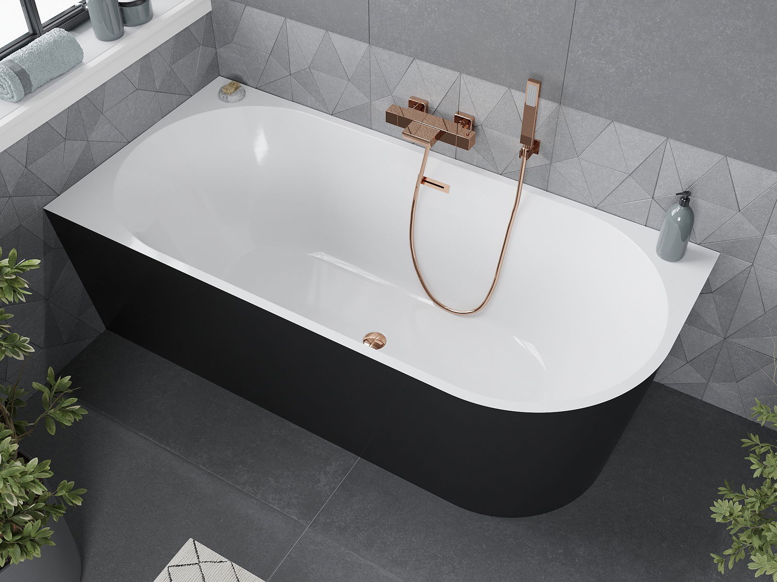 Mexen Mia vasca da bagno freestanding angolare sinistra 150 x 75 cm, bianca/nera, troppopieno oro rosa - 52691507575L-60