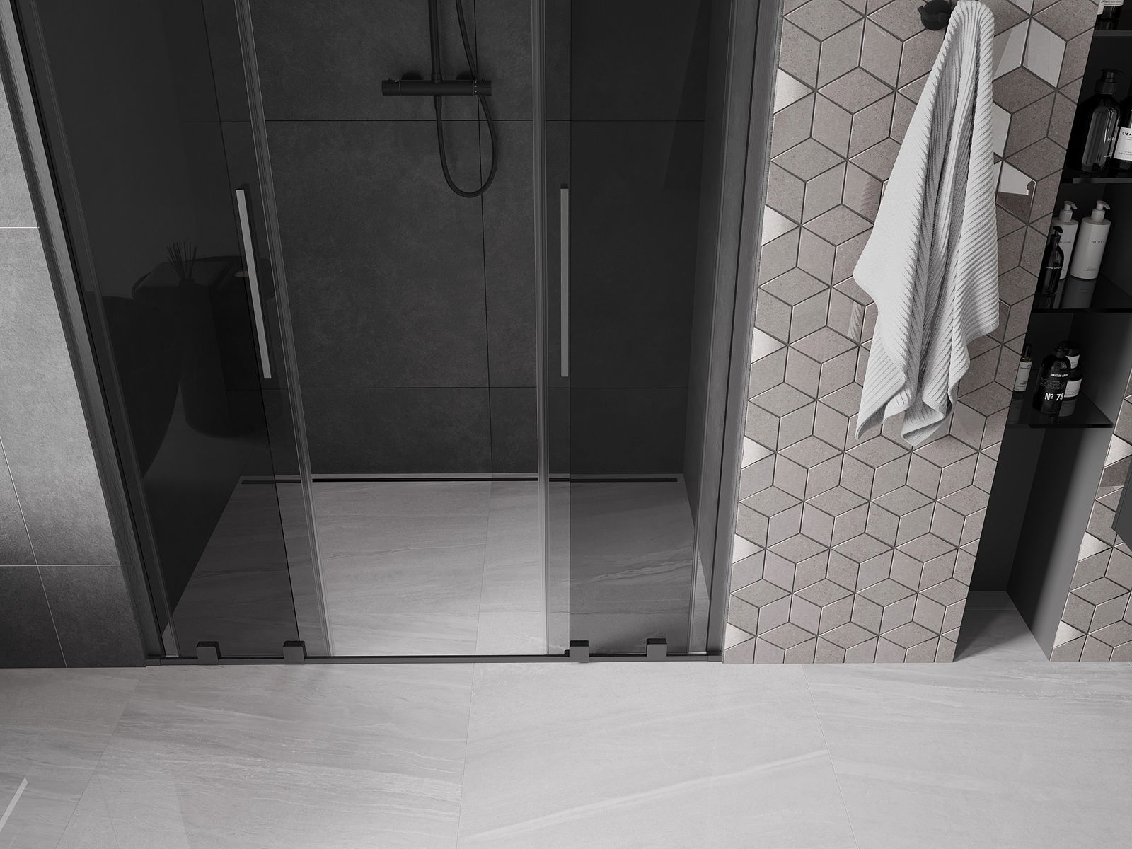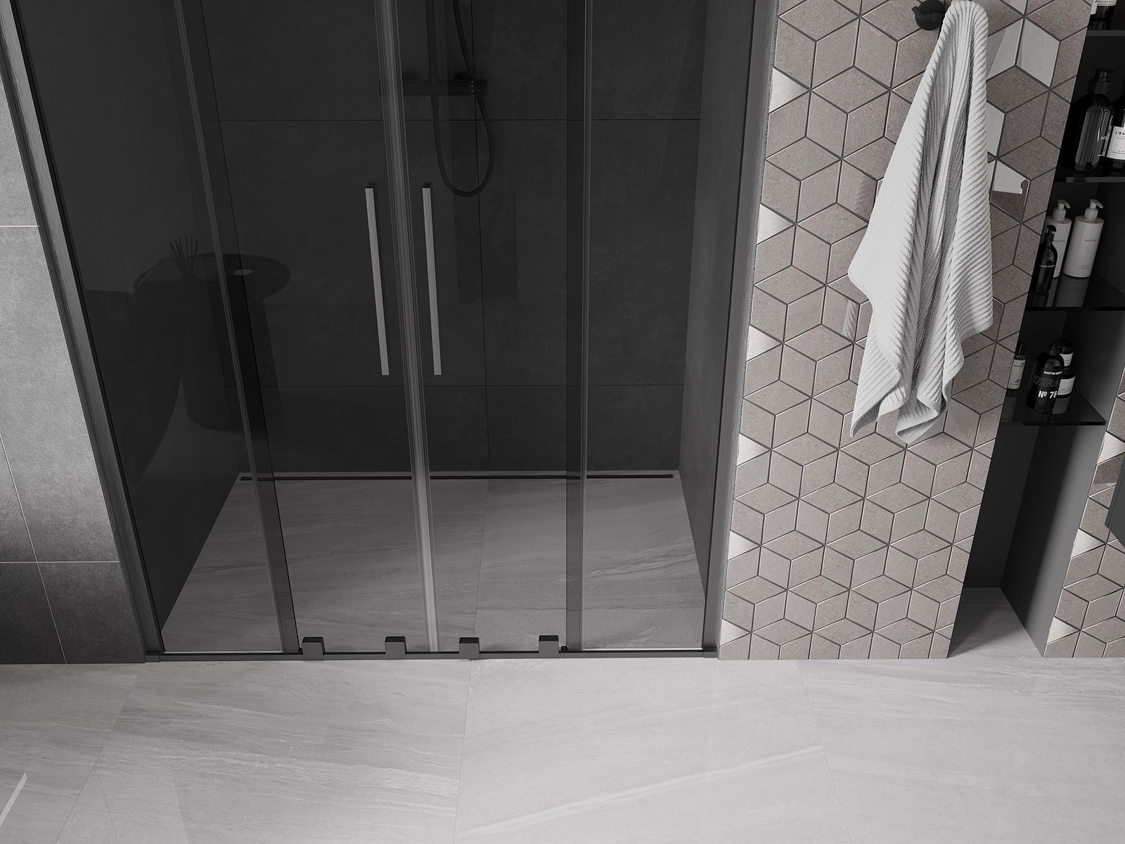 La comoda e pratica maniglia è realizzata in acciaio inossidabile. La forma alla moda unita alla finitura abbinata al colore dei profili conferisce all'intero un aspetto moderno e stiloso, evidenziando l'estetica di ogni bagno.