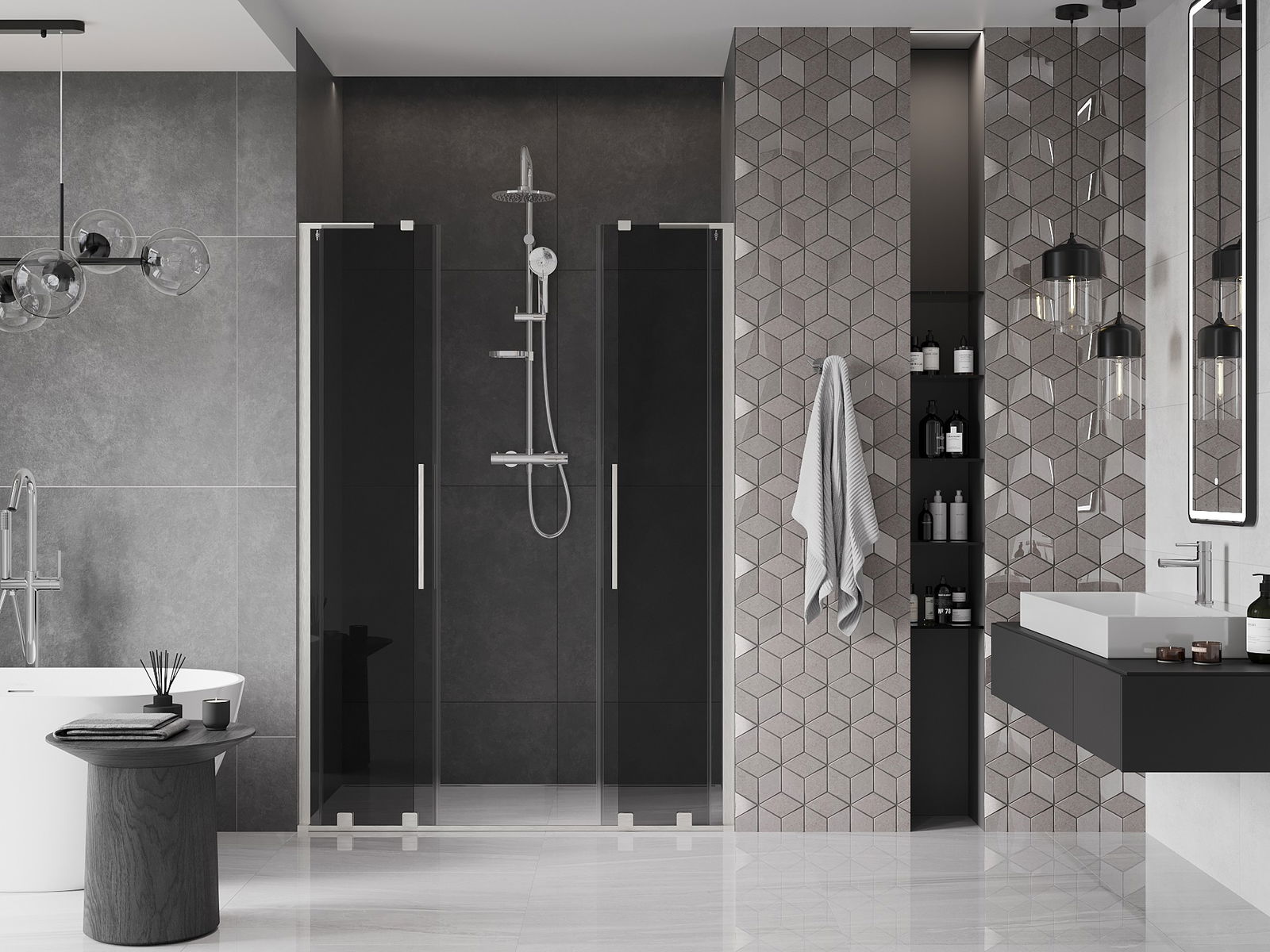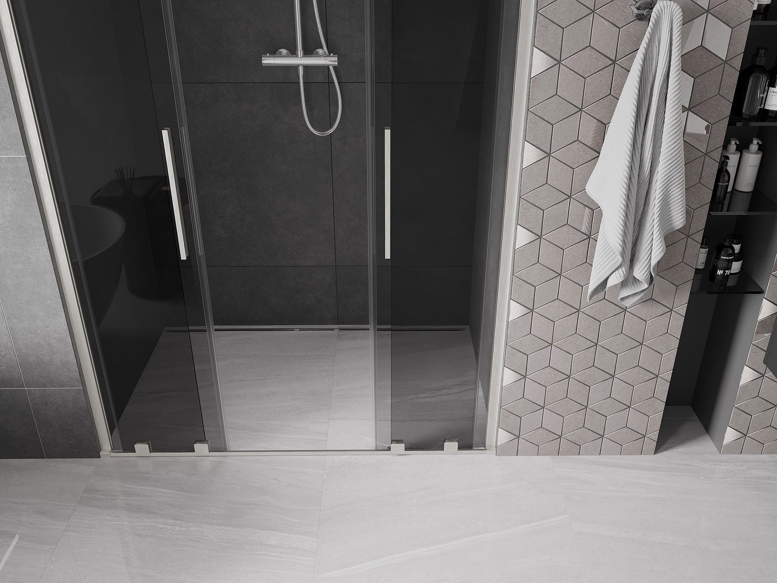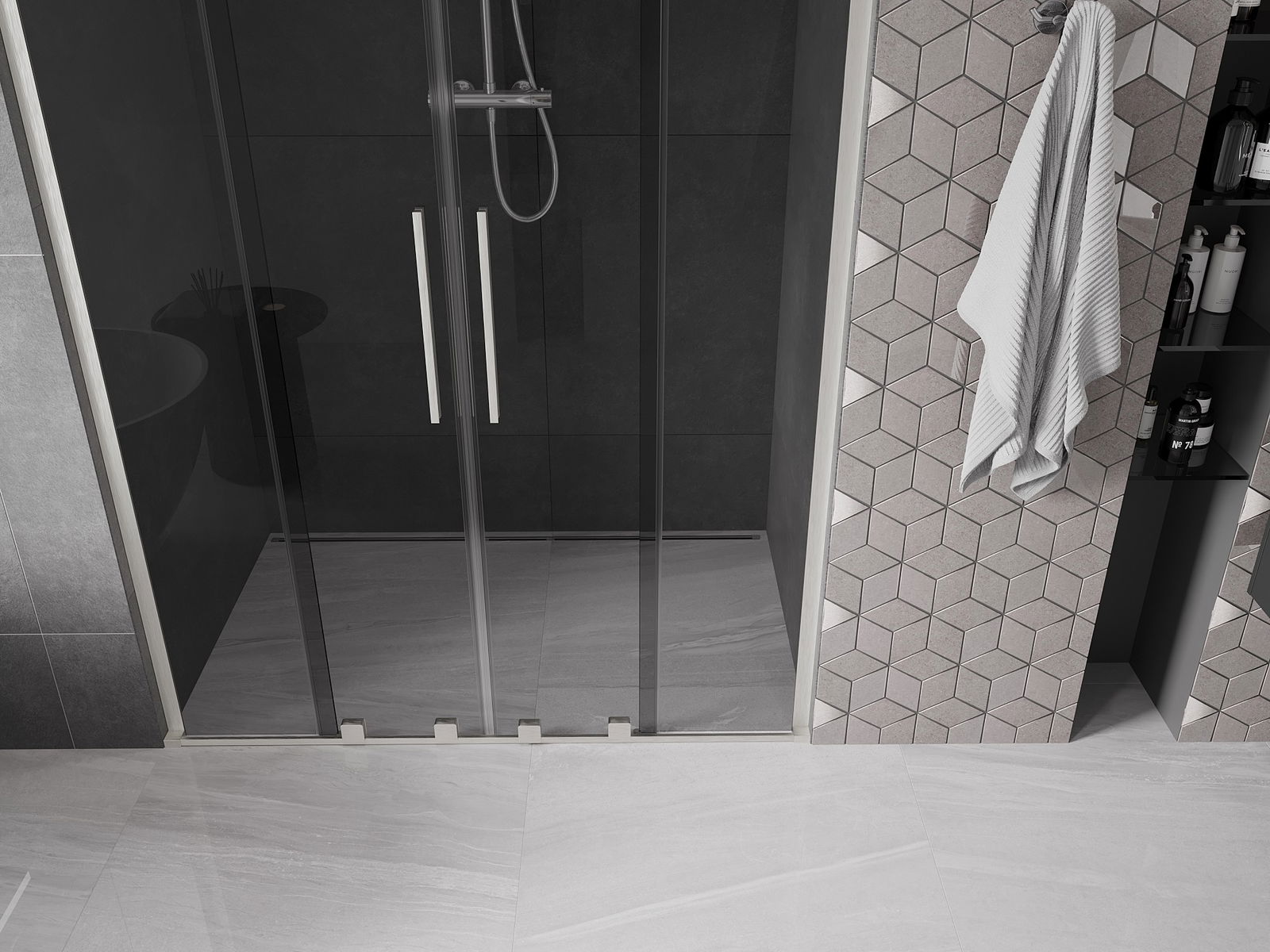 La comoda e pratica maniglia è realizzata in acciaio inossidabile. La forma alla moda unita alla finitura abbinata al colore dei profili conferisce all'intero un aspetto moderno e stiloso, evidenziando l'estetica di ogni bagno.