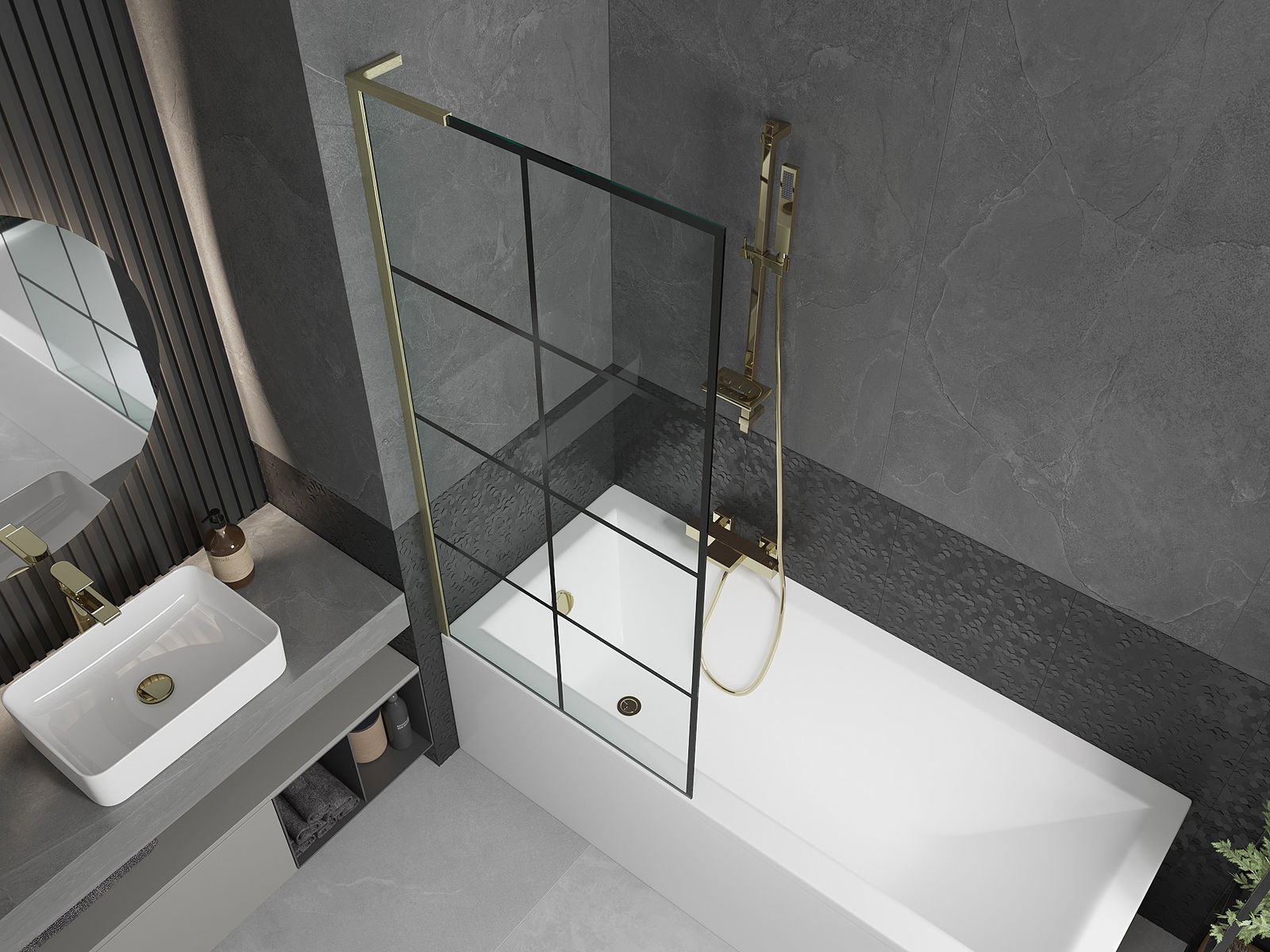 Mexen Next L paratia per vasca da bagno a 1 anta 80 x 150 cm, griglia nera, oro spazzolato - 895-080-000-03-77-55