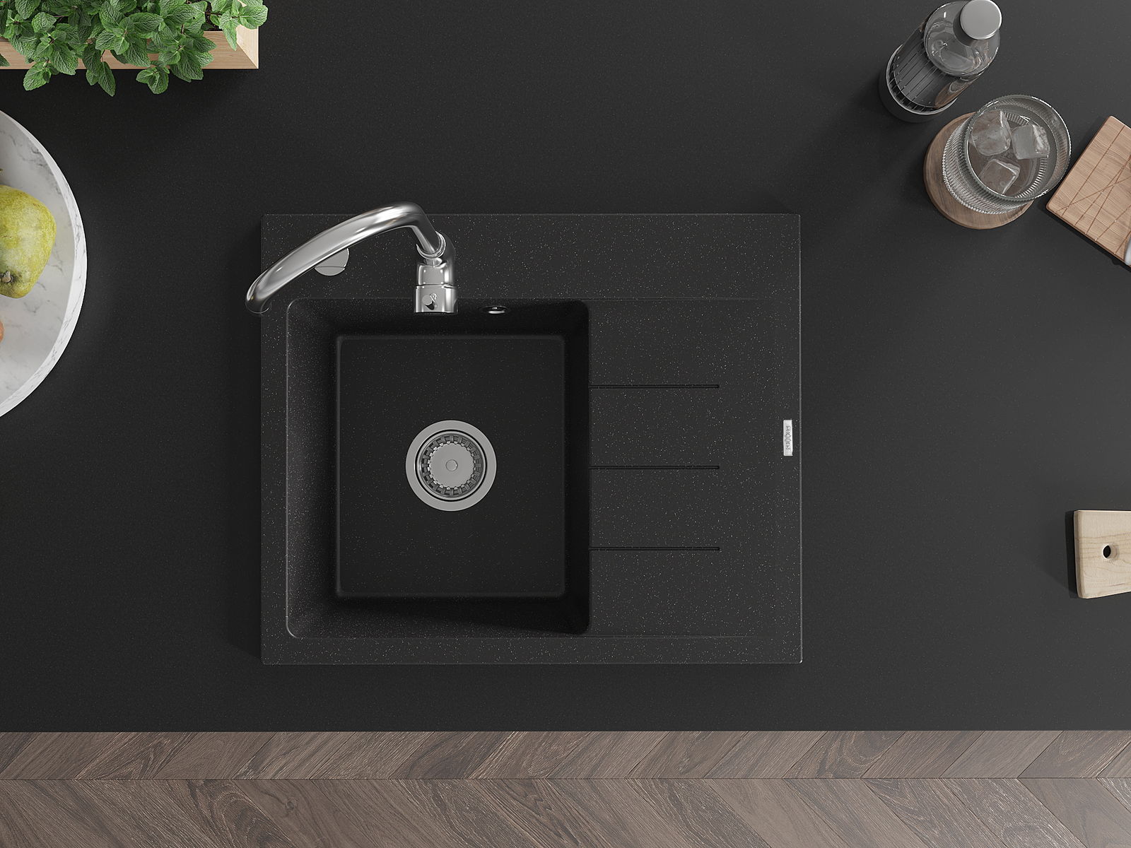 Mexen Ben lavello in granito monovasca con sgocciolatoio, sinistro 600 x 500 mm, nero/argento metallizzato, sifone cromato