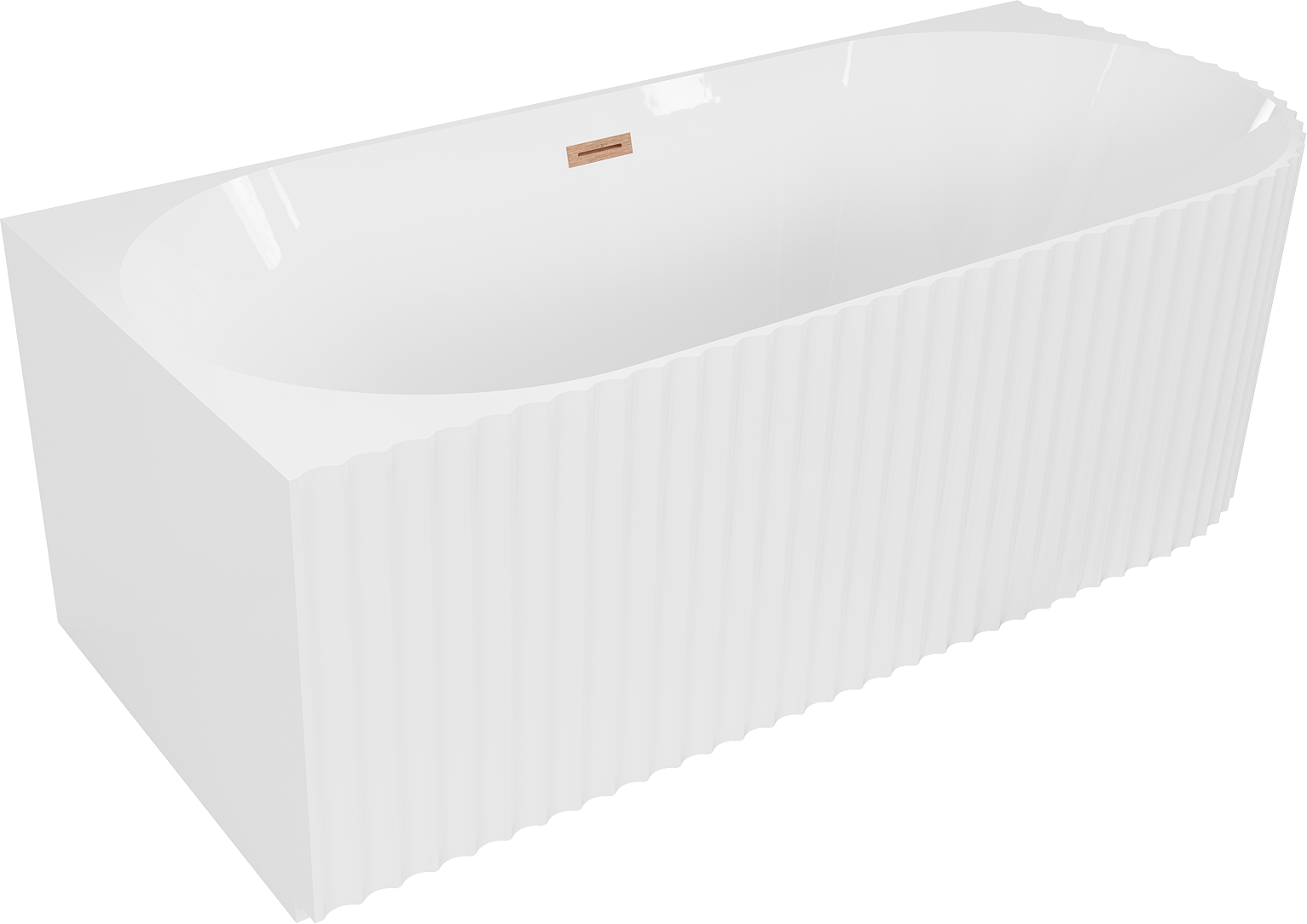 Mexen Gia vasca da bagno freestanding angolare scanalata sinistra 150 x 75 cm, bianco lucido, troppopieno in rame spazzolato