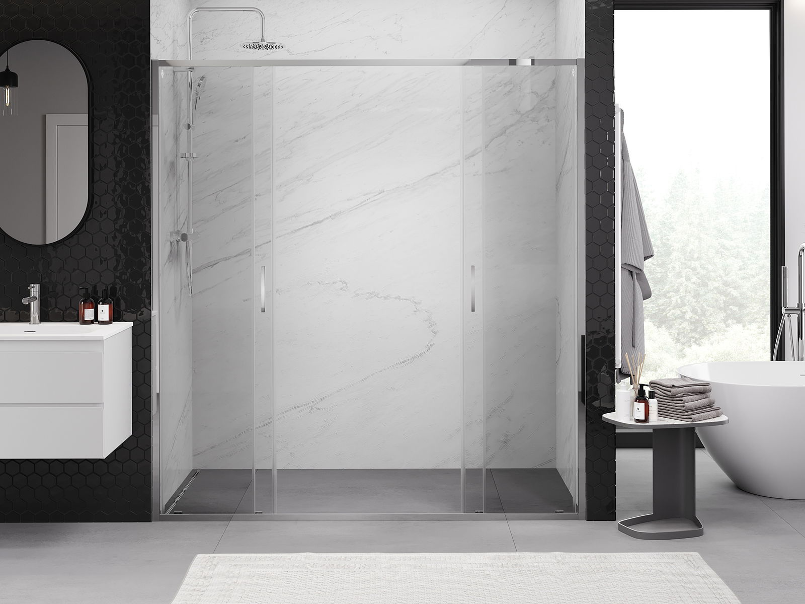 Grazie all'uso di un sistema di montaggio universale, le porte della doccia possono essere montate a destra o a sinistra, a seconda delle esigenze. In questo modo puoi progettare facilmente una doccia adatta allo spazio del bagno.