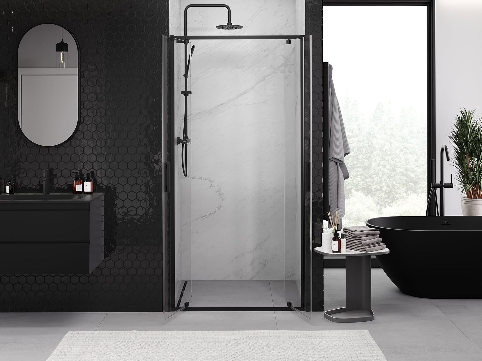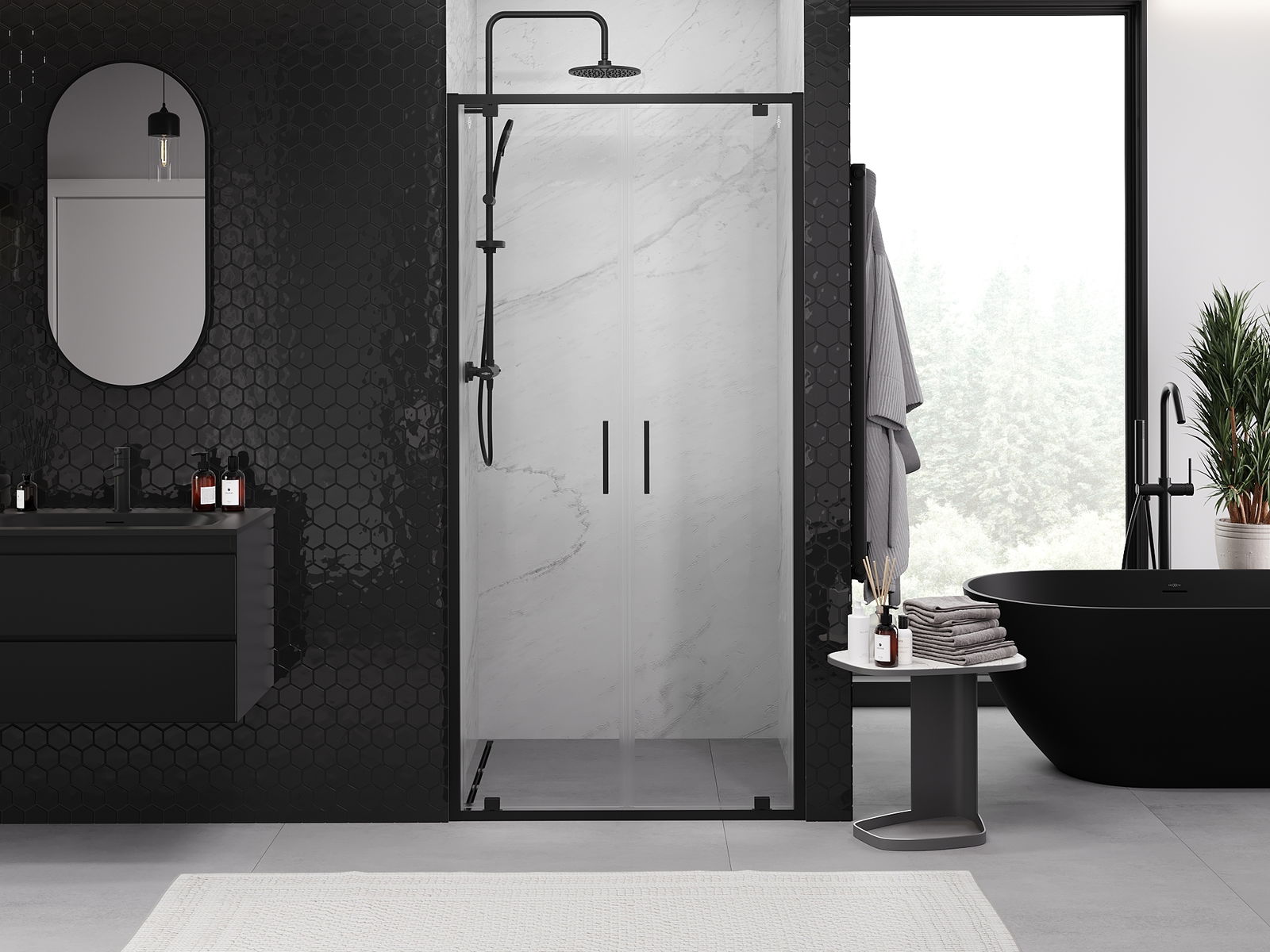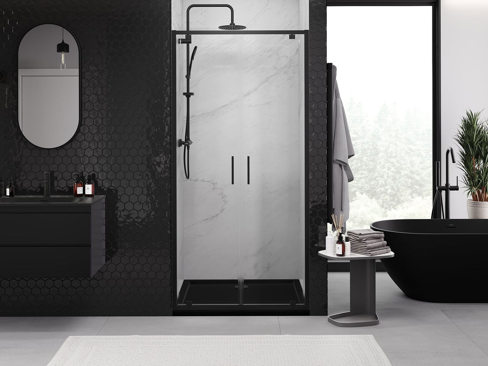 L'impugnatura pratica e comoda è realizzata in metallo durevole e resistente. La forma alla moda combinata con una finitura abbinata al colore dei profili conferisce all'insieme un aspetto moderno e elegante, enfatizzando l'estetica di ogni bagno.