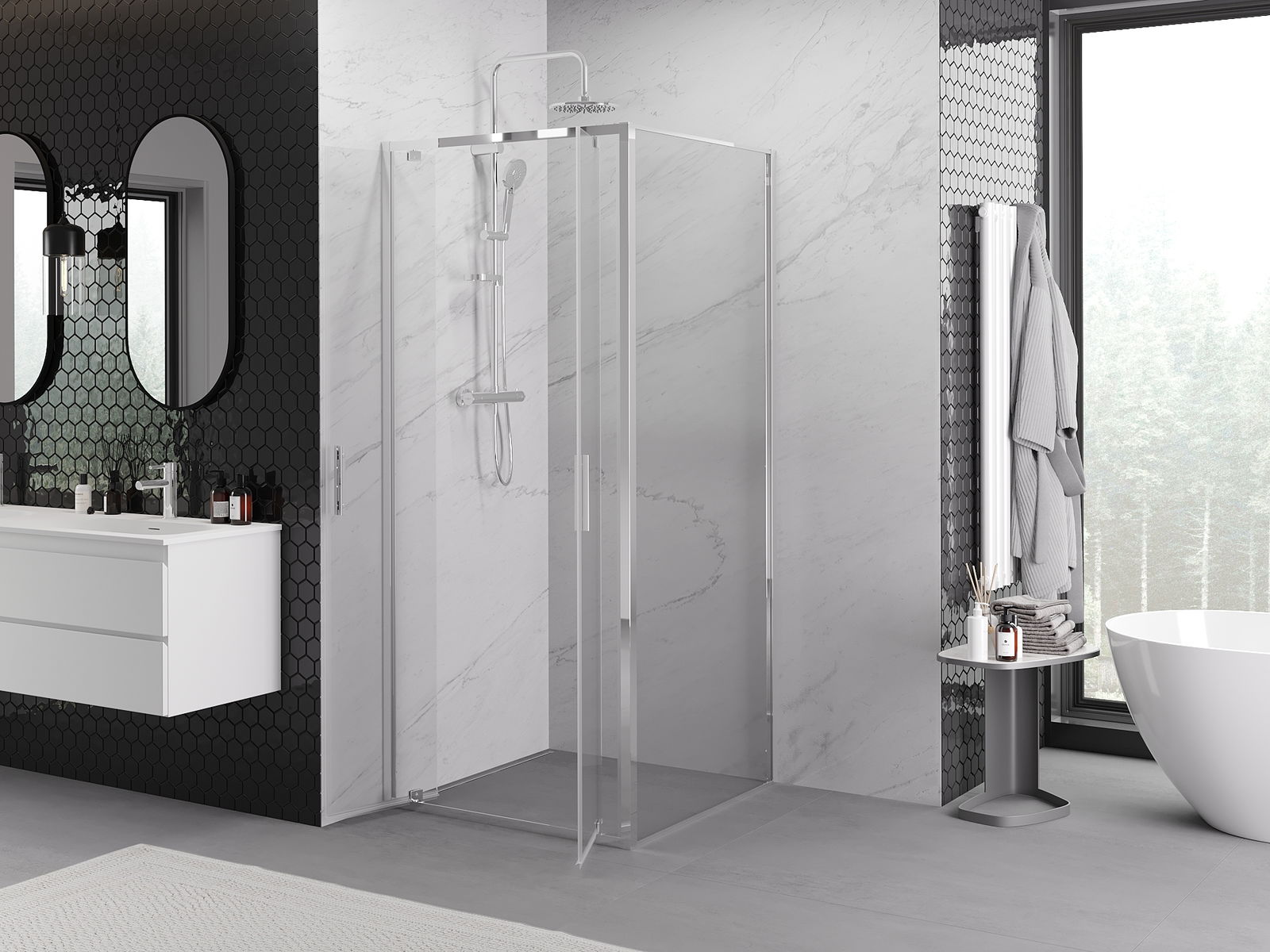 Grazie all'uso di un sistema di montaggio universale, le porte della doccia possono essere montate a destra o a sinistra, a seconda delle esigenze. In questo modo puoi progettare facilmente una doccia adatta allo spazio del bagno.