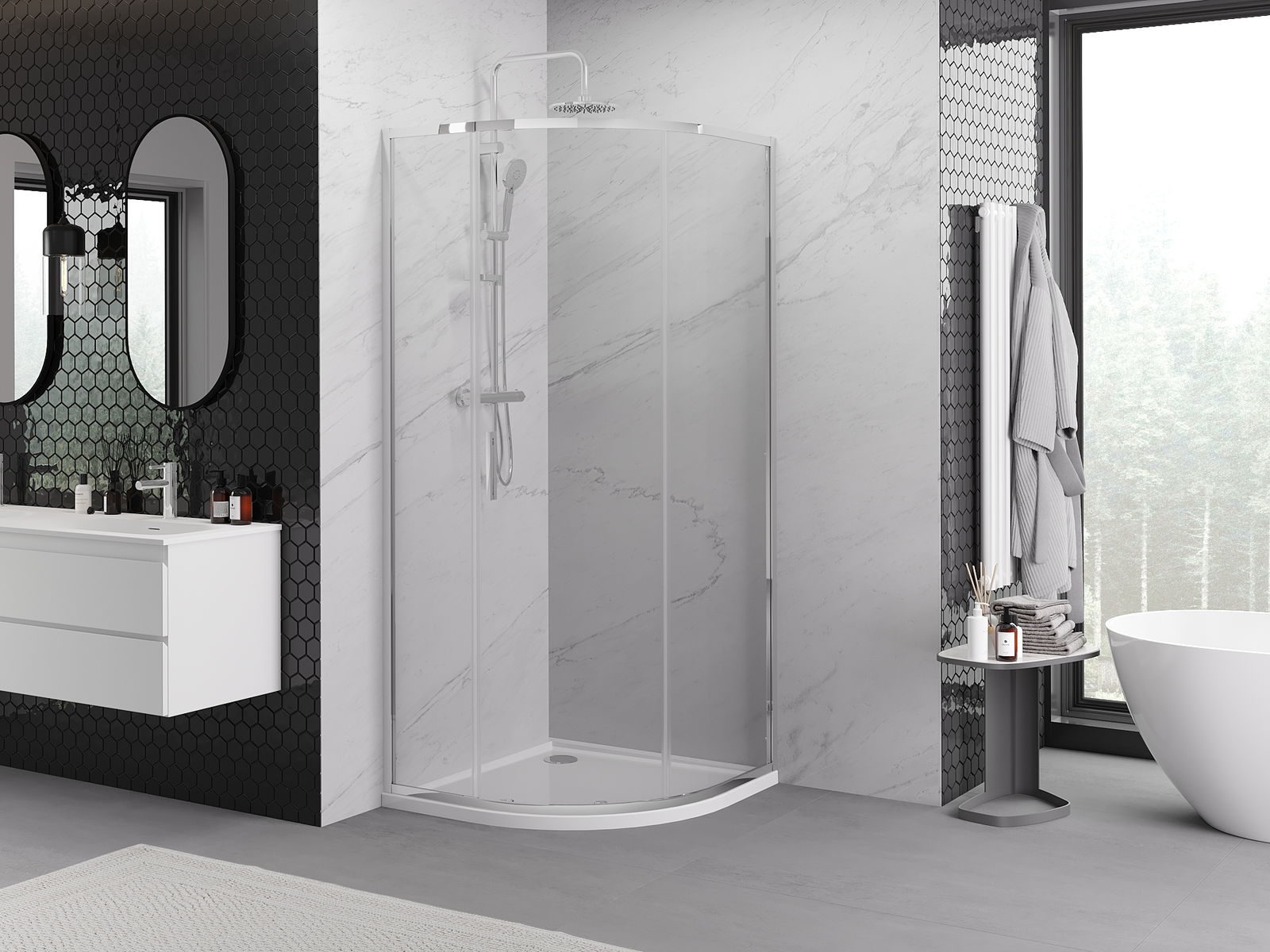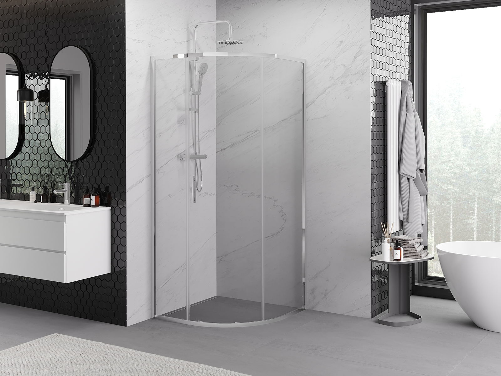 L'impugnatura pratica e comoda è realizzata in metallo durevole e resistente. La forma alla moda combinata con una finitura abbinata al colore dei profili conferisce all'insieme un aspetto moderno e elegante, enfatizzando l'estetica di ogni bagno.