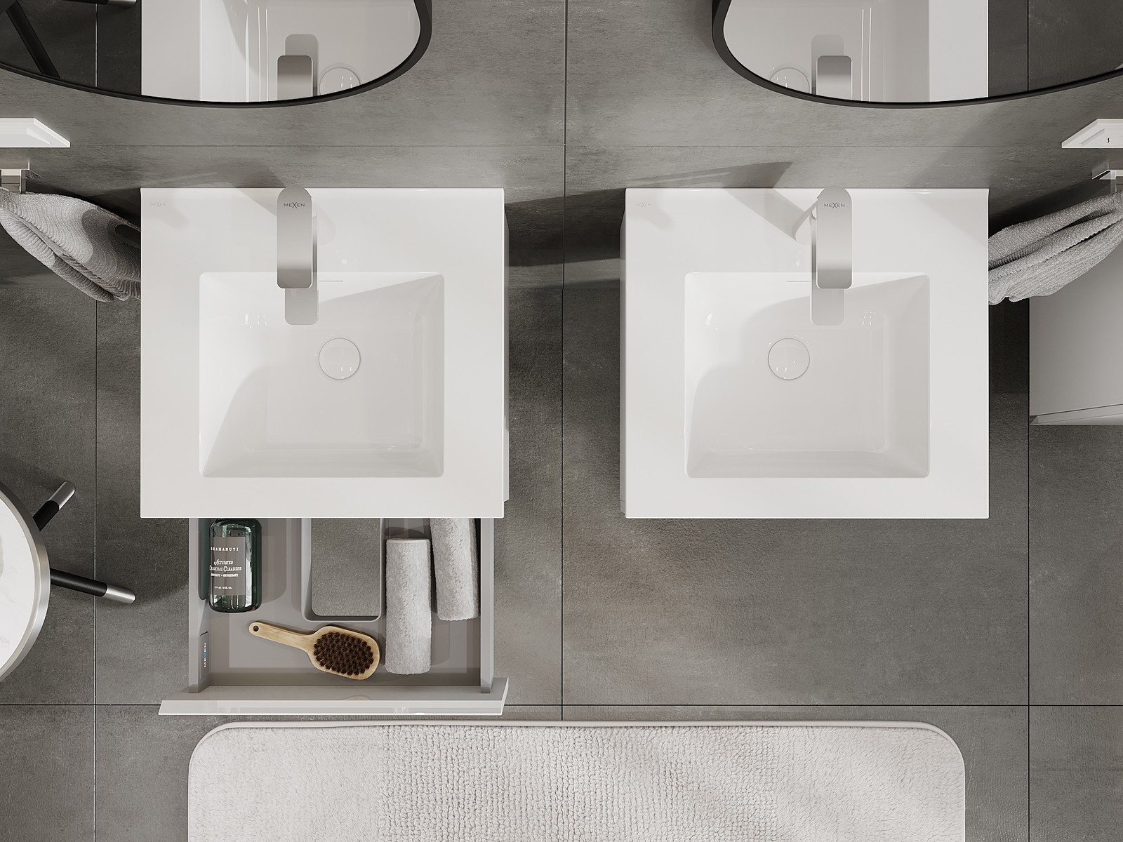 I nostri mobili da bagno modulari possono essere combinati tra loro in diverse configurazioni di colore, consentendo una personalizzazione completa. È possibile scegliere sia l'aspetto che le funzioni dei singoli elementi, permettendo di adattare i mobili alle proprie preferenze stilistiche e di utilizzo.