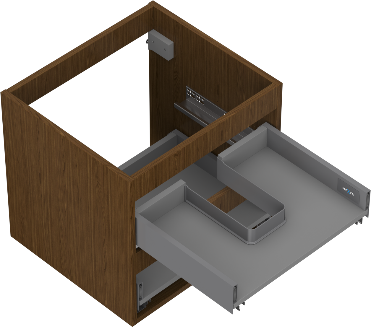 Il ritaglio nel cassetto è progettato in modo da ospitare il sifone, che è necessario nelle installazioni dei lavandini. Grazie a ciò, il mobile può essere montato in modo completamente funzionale, senza dover rinunciare allo spazio nel cassetto a favore dell'installazione.