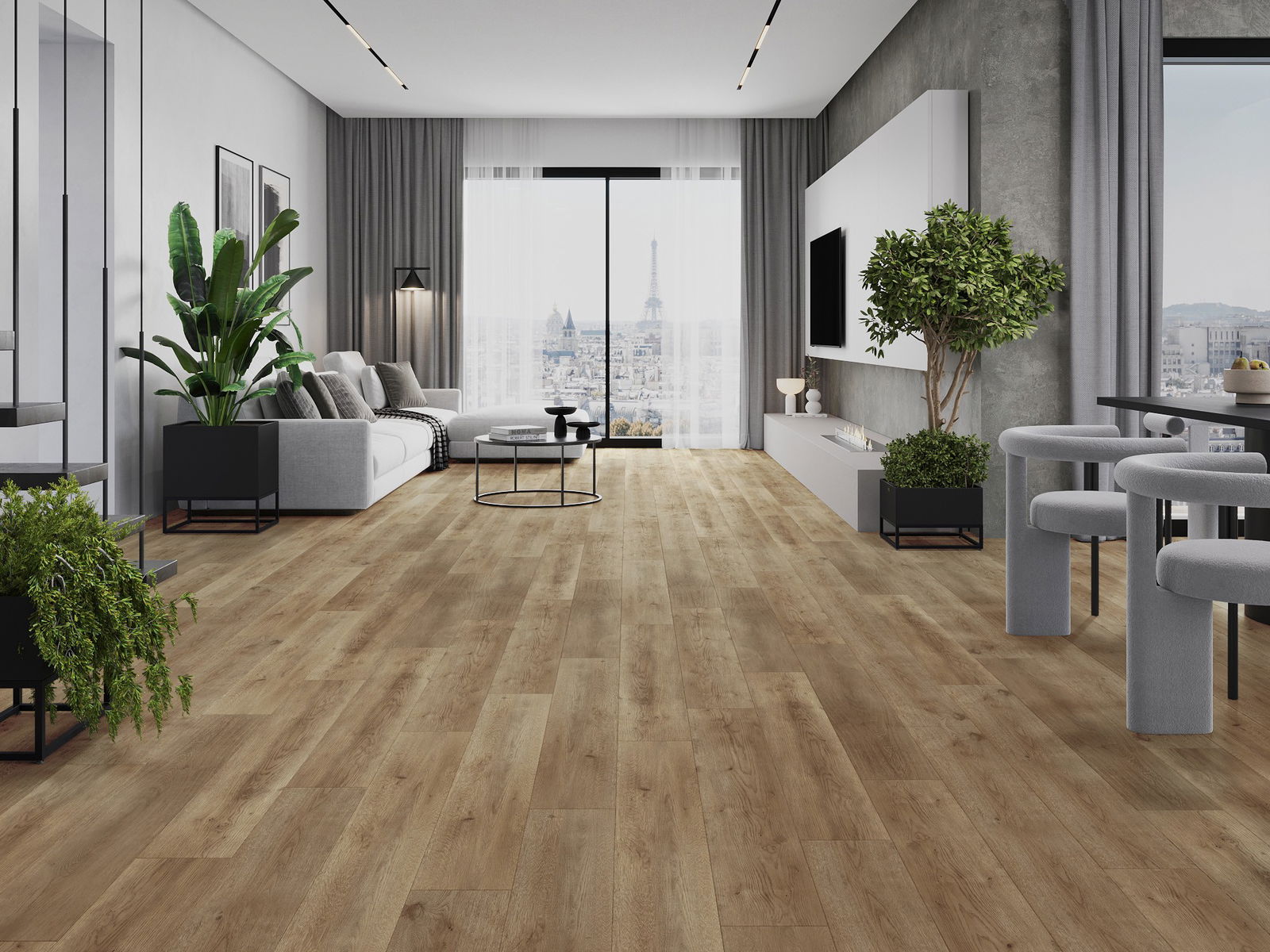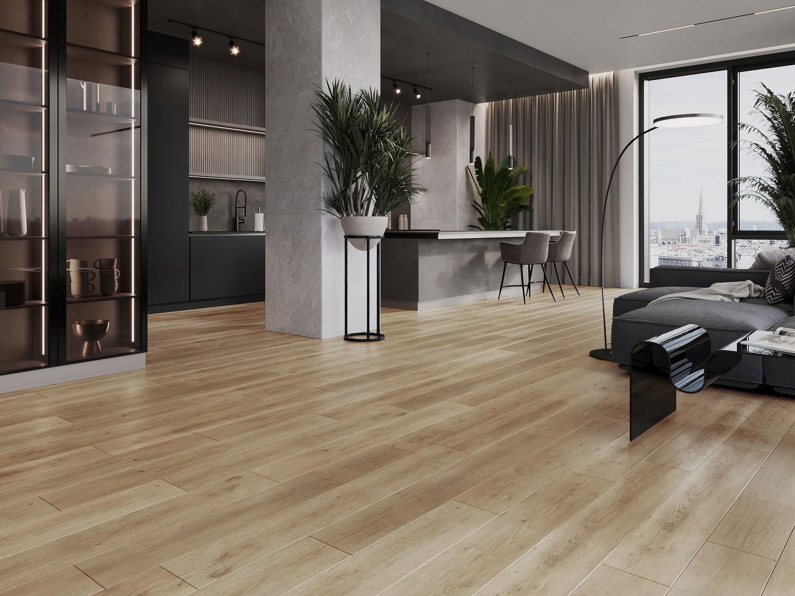 I pannelli hanno una fuga a 4 lati - ogni lato è stato fresato in modo tale che, una volta posati, creino un collegamento a forma di V. Questo design rende la struttura del pavimento più chiara, conferendo al pavimento maggiore profondità e un carattere estetico. Questo effetto è particolarmente apprezzato nelle moderne disposizioni, dove i dettagli sottolineano l'aspetto eccezionale degli interni.