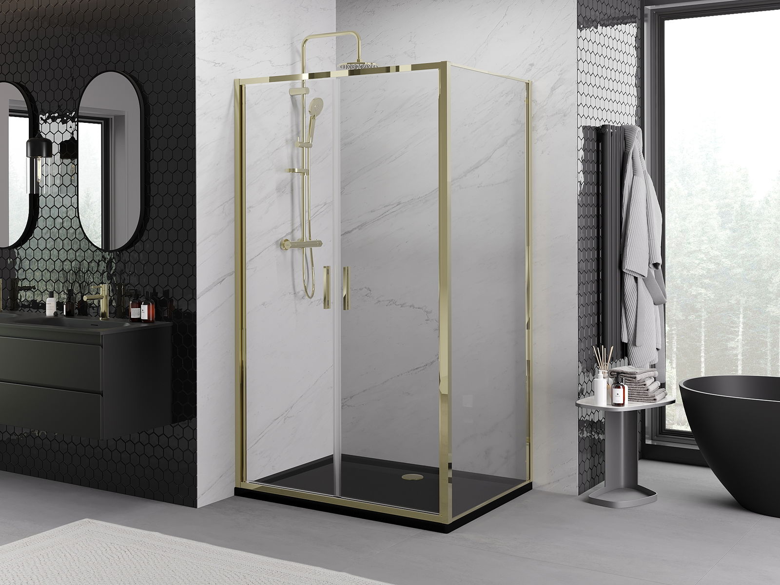 L'impugnatura pratica e comoda è realizzata in metallo durevole e resistente. La forma alla moda combinata con una finitura abbinata al colore dei profili conferisce all'insieme un aspetto moderno e elegante, enfatizzando l'estetica di ogni bagno.