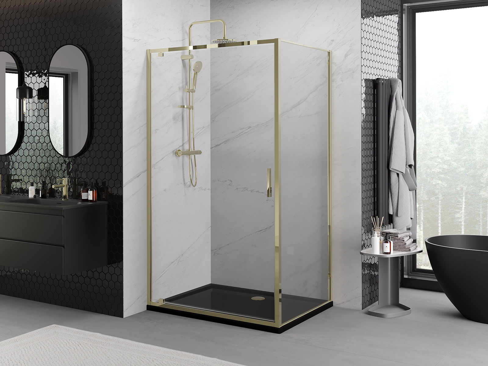 Il prodotto, a seconda delle esigenze, può essere installato sia sul piatto doccia che direttamente sul pavimento. Il metodo di installazione universale consente di adattare il prodotto a diversi tipi di bagni e configurazioni di spazio.