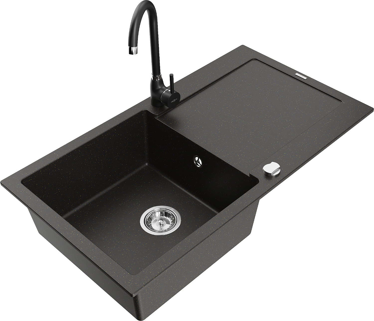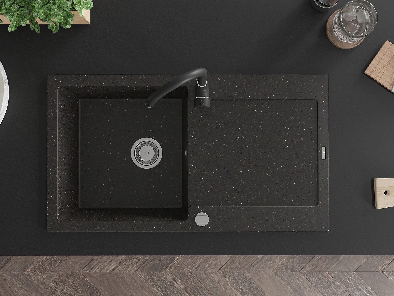 Mexen Leo lavello in granito a 1 vasca con scolapiatti e rubinetto da cucina Telma, nero/oro metallizzato - 6501-75-670200-70