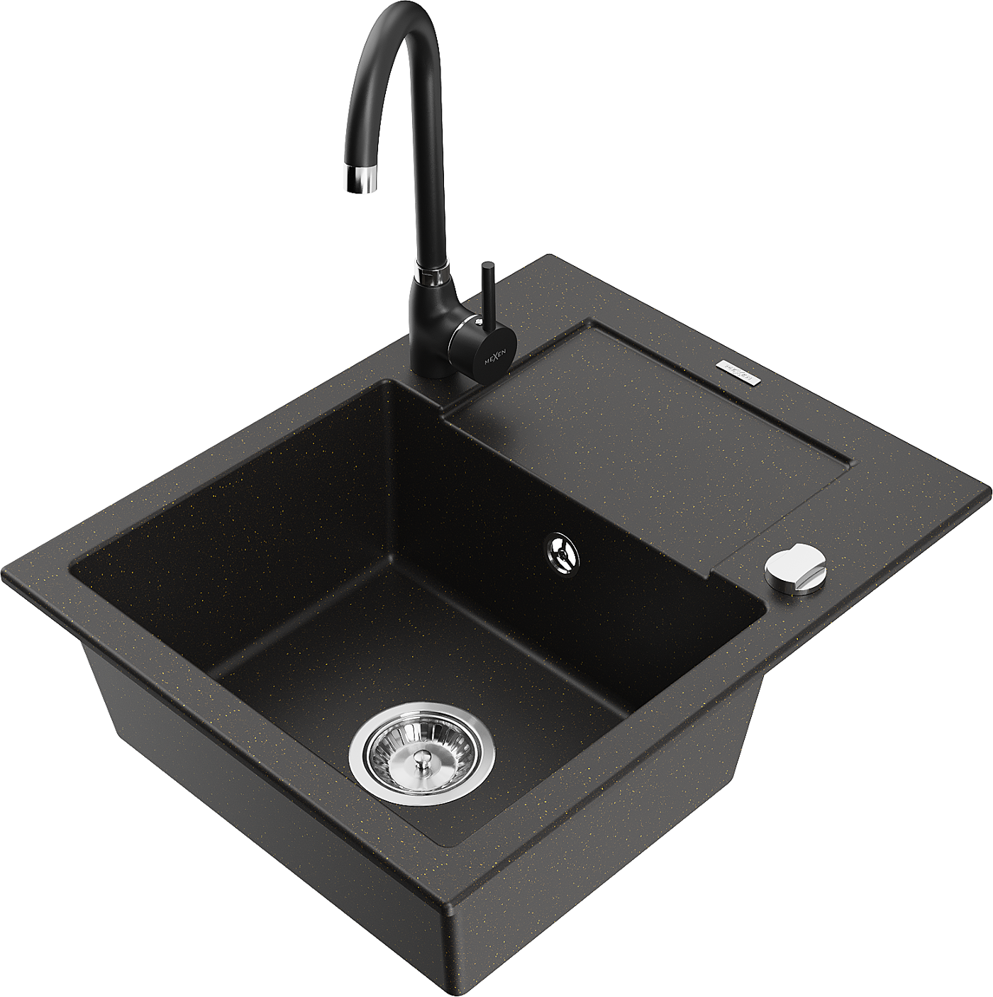 Mexen Enzo lavello da cucina in granito con 1 vasca, gocciolatoio e rubinetto Telma, nero/oro - 6506-75-670200-70