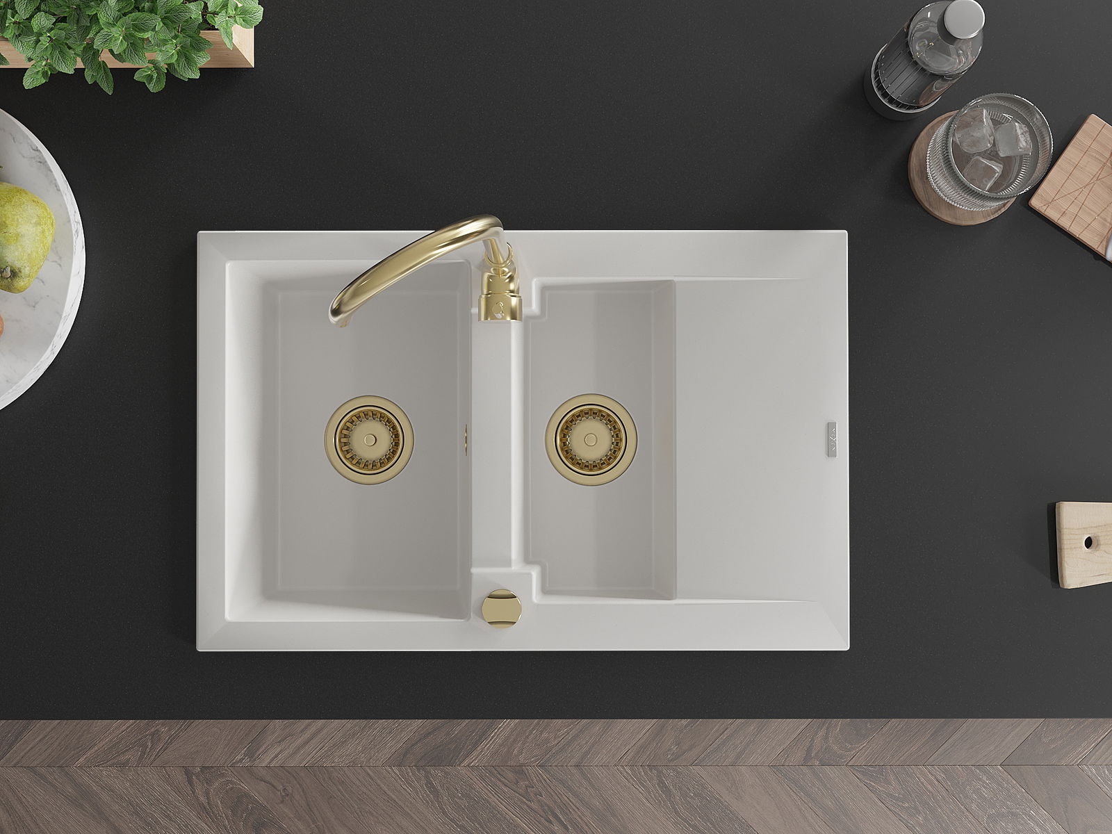 Mexen Gaspar lavello da cucina in granito 1,5 vasche con sgocciolatoio e rubinetto da cucina Telma, bianco - 6507-20-670200-50