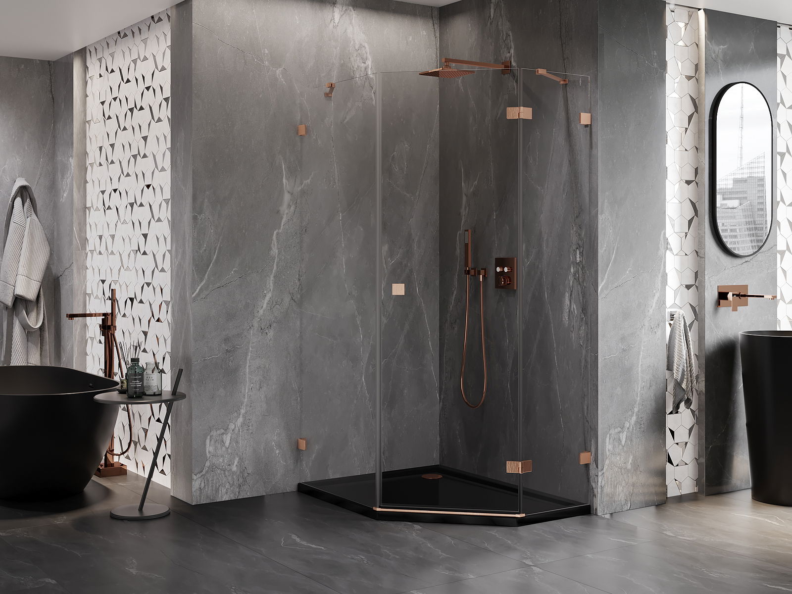 Mexen Lunar cabina doccia pentagonale battente destra 80 x 100 cm, trasparente, rame spazzolato - 831-080P-100L-65-00-P