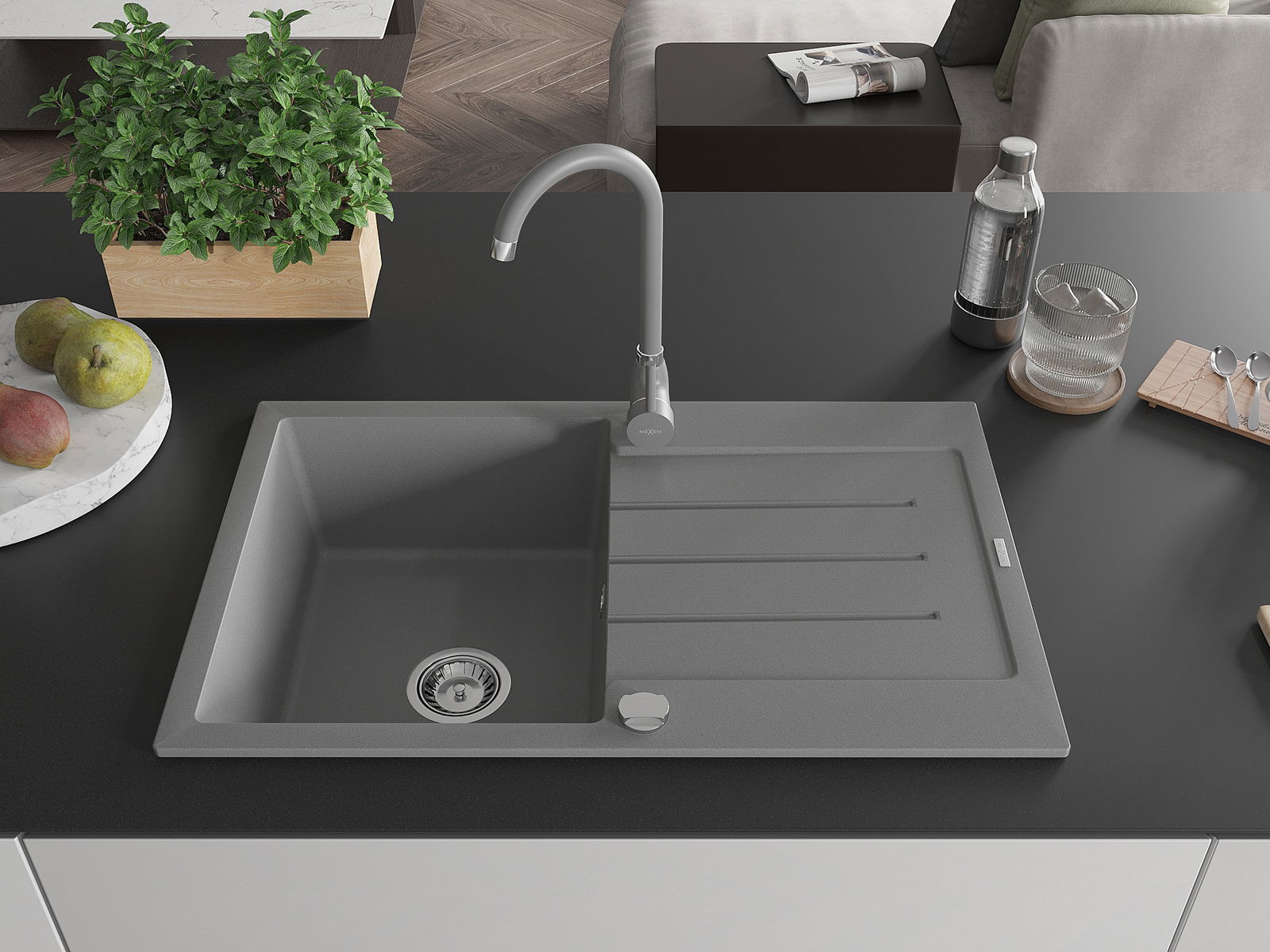 Mexen Bruno lavello in granito a 1 vasca con sgocciolatoio e rubinetto da cucina Telma, grigio - 6513-71-670200-71
