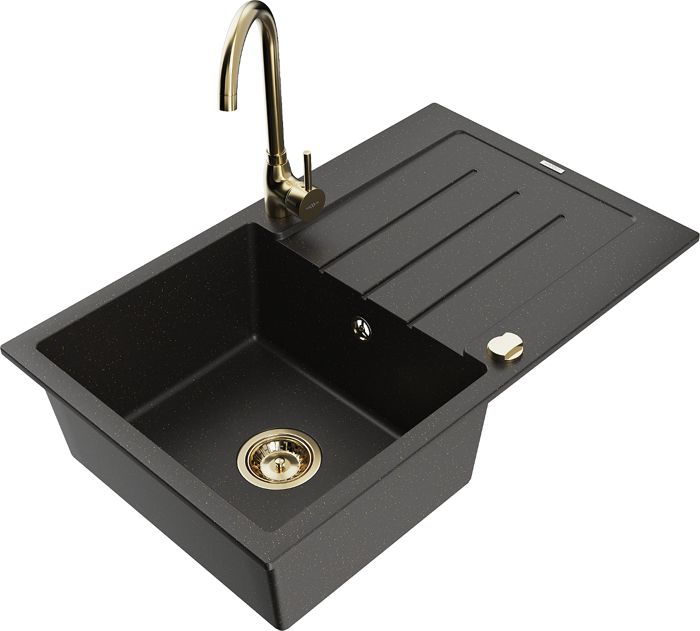 Mexen Bruno lavello in granito 1-vasca con sgocciolatoio e rubinetto da cucina Telma, nero/oro - 6513-75-670200-50