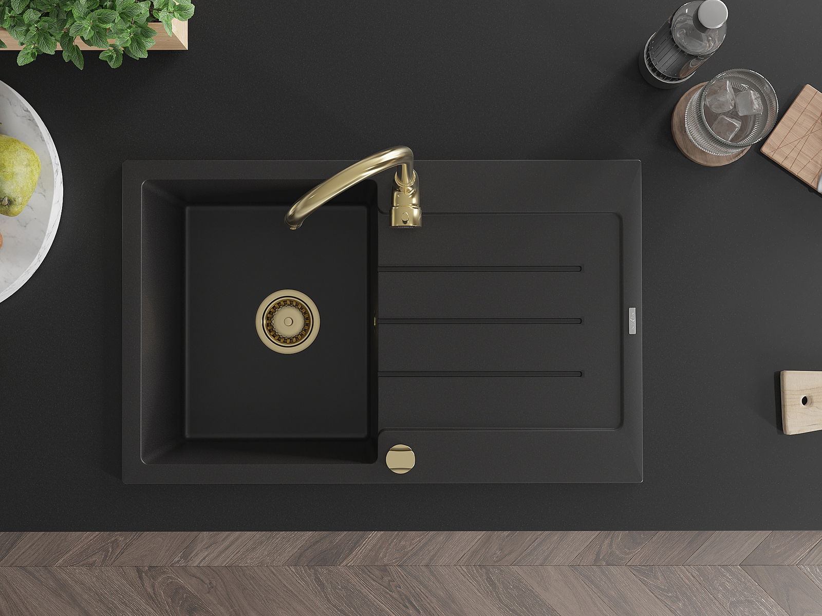Mexen Bruno lavello in granito 1-vasca con sgocciolatoio e rubinetto da cucina Telma, nero - 6513-77-670200-50