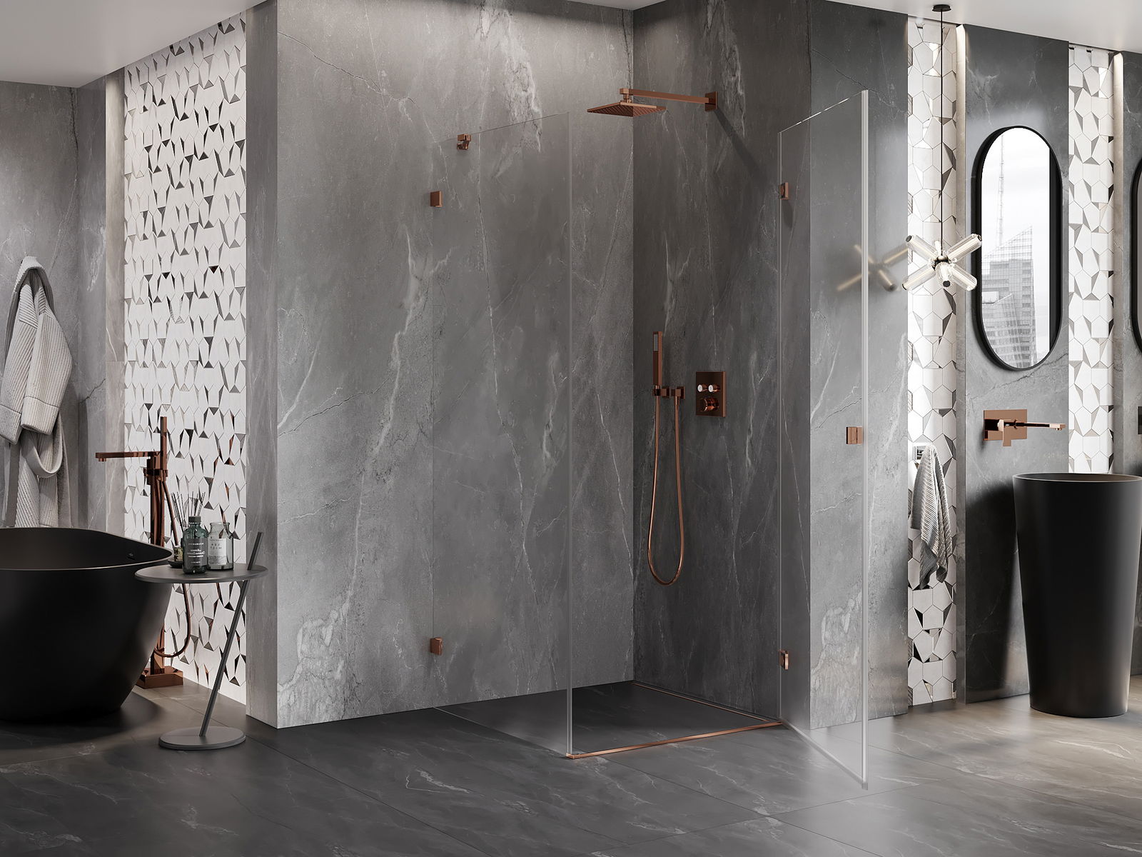 L'impugnatura pratica e comoda è realizzata in metallo durevole e resistente. La forma alla moda combinata con una finitura abbinata al colore dei profili conferisce all'insieme un aspetto moderno e elegante, enfatizzando l'estetica di ogni bagno.