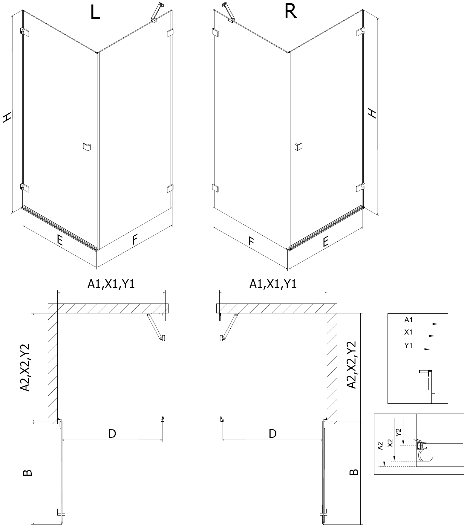 Dimensione: 90x90 cm (porta destra 90 cm, parete 90 cm)