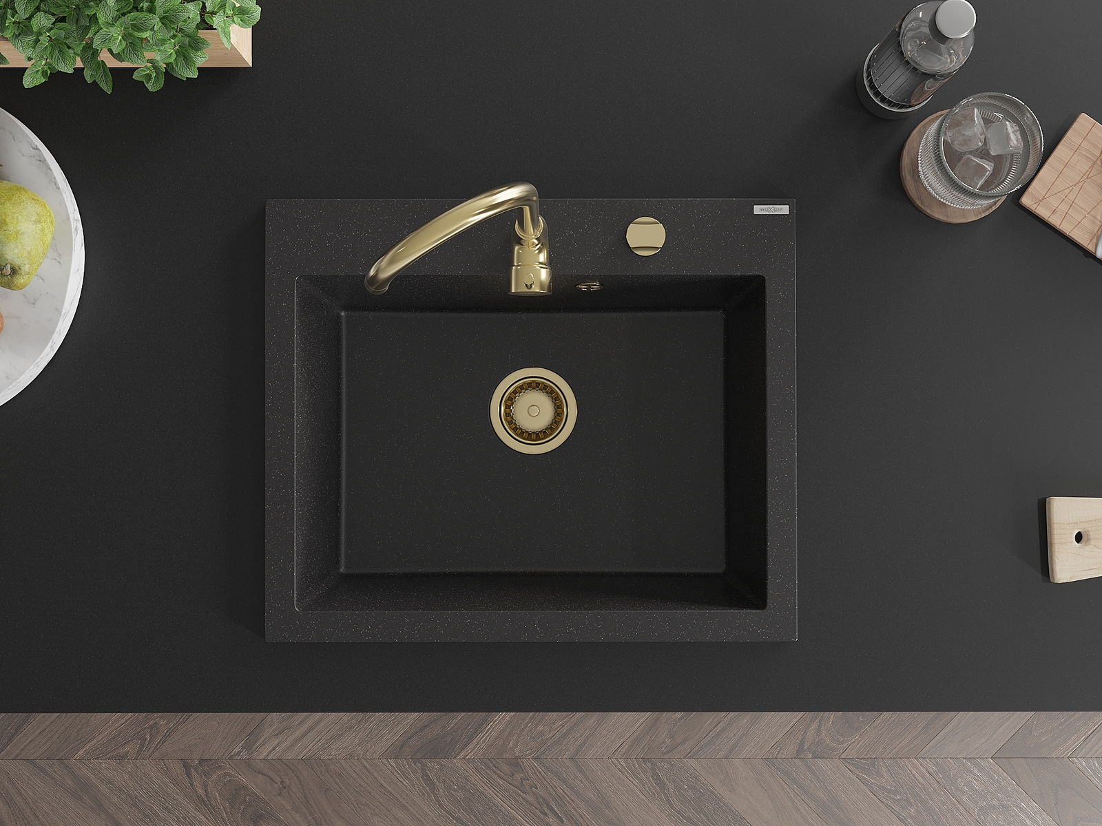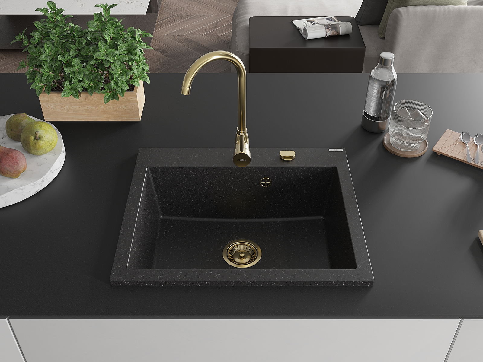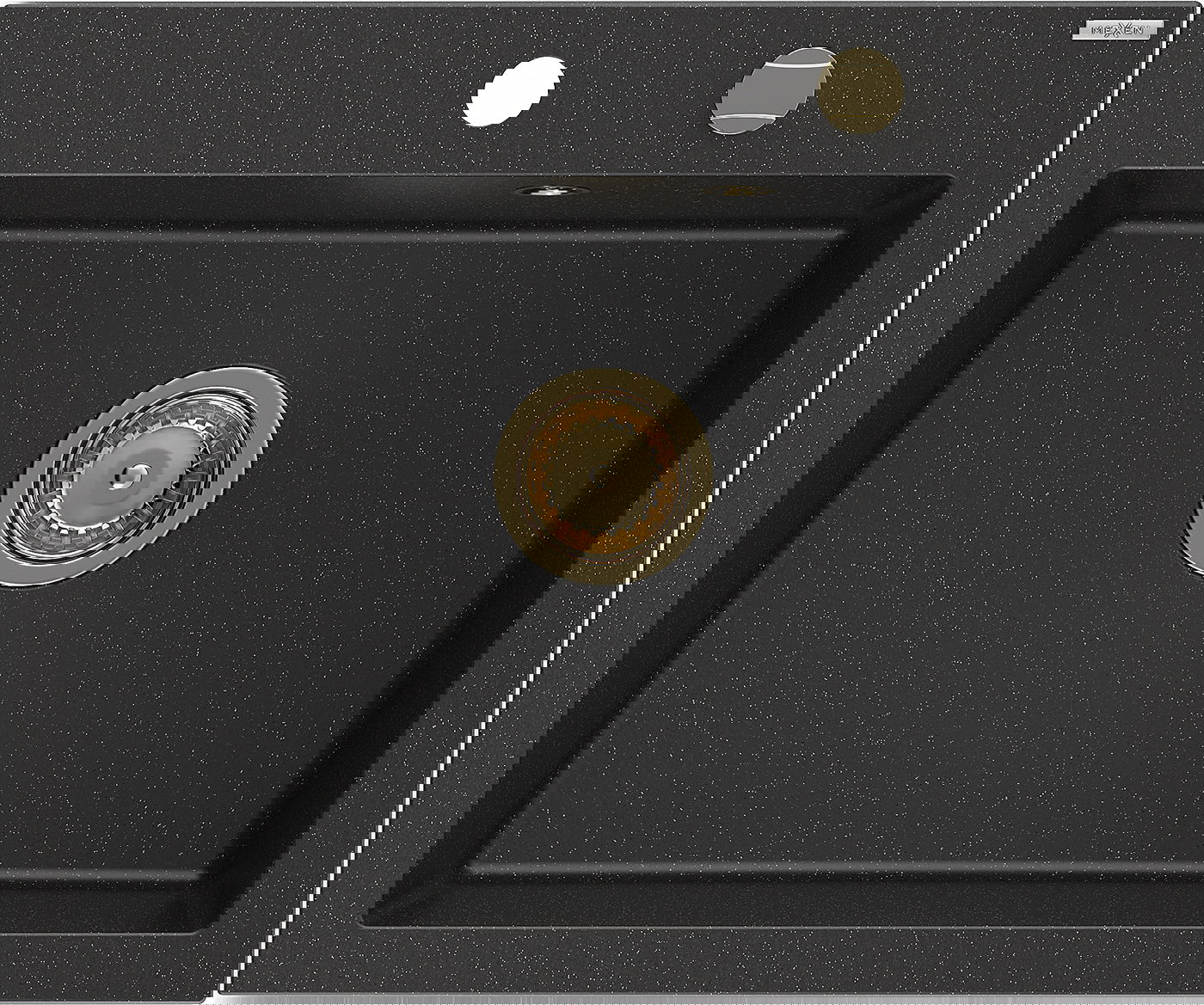 Mexen Elix lavello da cucina in granito 1-vasca 600 x 500 mm, nero/argento metallizzato, sifone dorato - 6525601005-73-G
