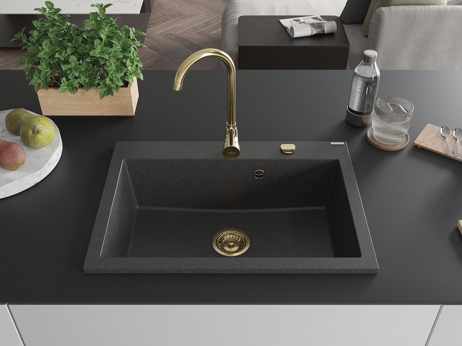 Mexen Elix lavello in granito a 1 vasca 700 x 500 mm, nero granito, sifone oro - 6526701005-76-G