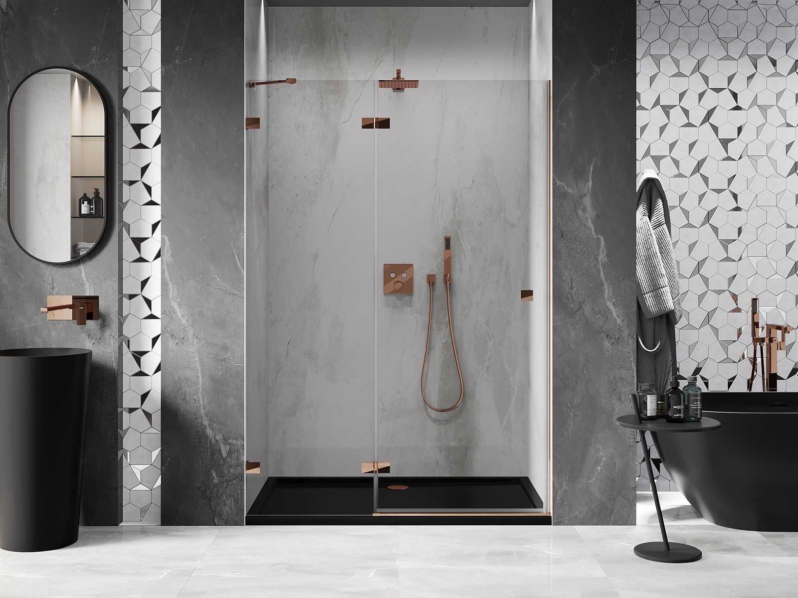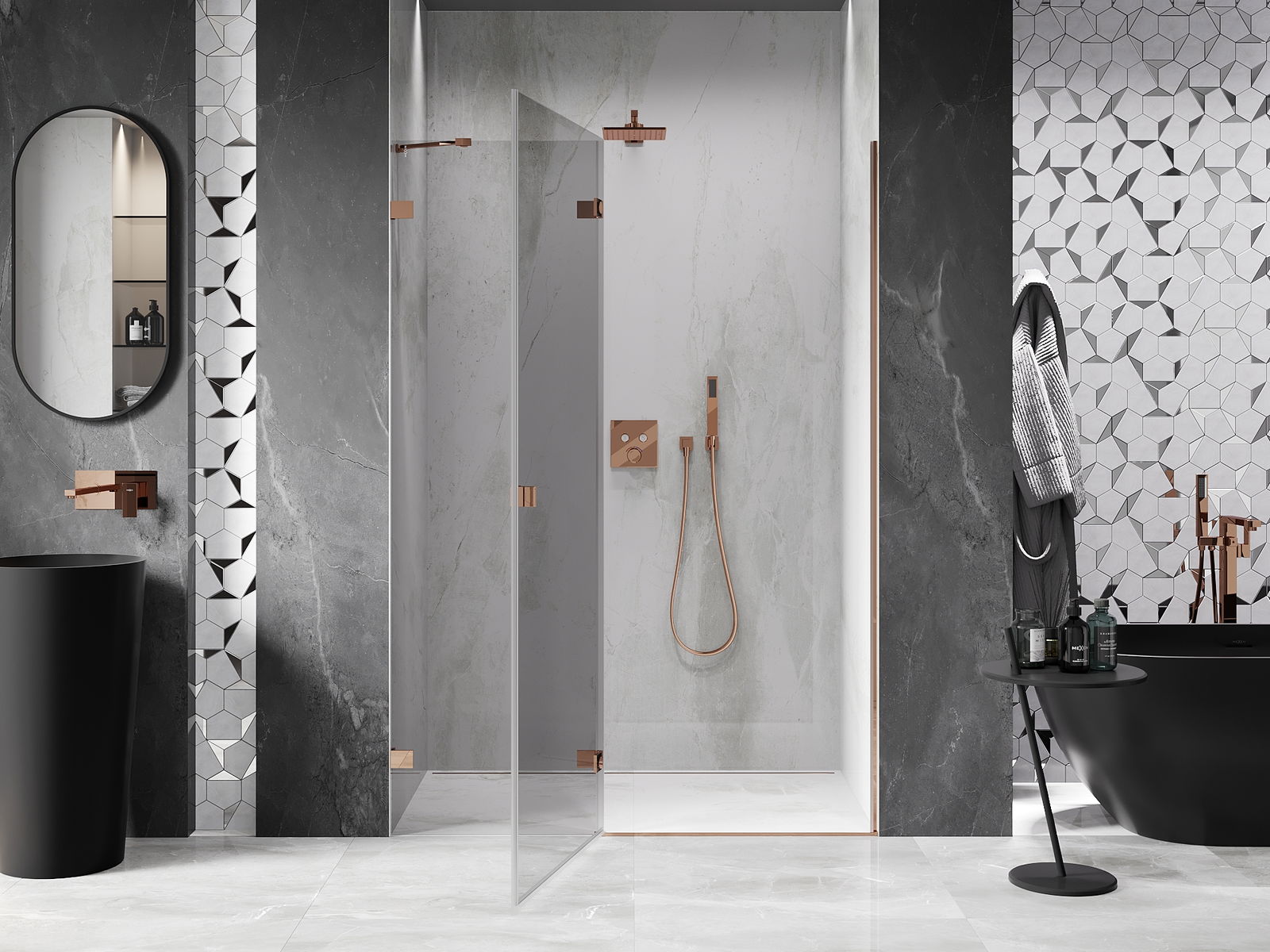 L'impugnatura pratica e comoda è realizzata in metallo durevole e resistente. La forma alla moda combinata con una finitura abbinata al colore dei profili conferisce all'insieme un aspetto moderno e elegante, enfatizzando l'estetica di ogni bagno.