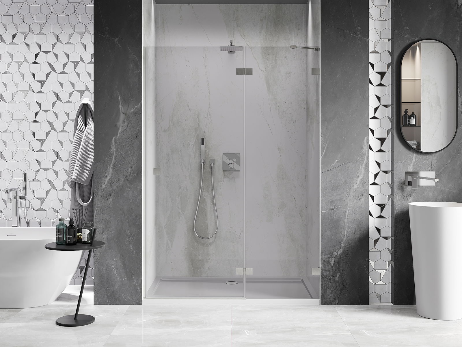 Il prodotto, a seconda delle esigenze, può essere installato sia sul piatto doccia che direttamente sul pavimento. Il metodo di installazione universale consente di adattare il prodotto a diversi tipi di bagni e configurazioni di spazio.