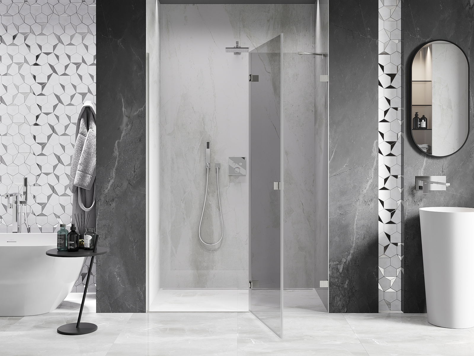 Le porte a battente offrono la massima libertà durante l'uso. Dispongono di robusti cardini realizzati in materiale durevole, che non creano difficoltà nella pulizia e consentono un facile accesso all'interno della cabina.