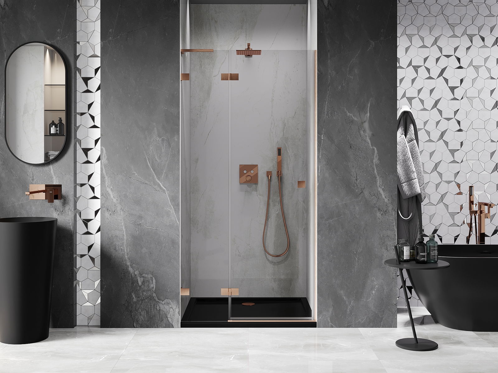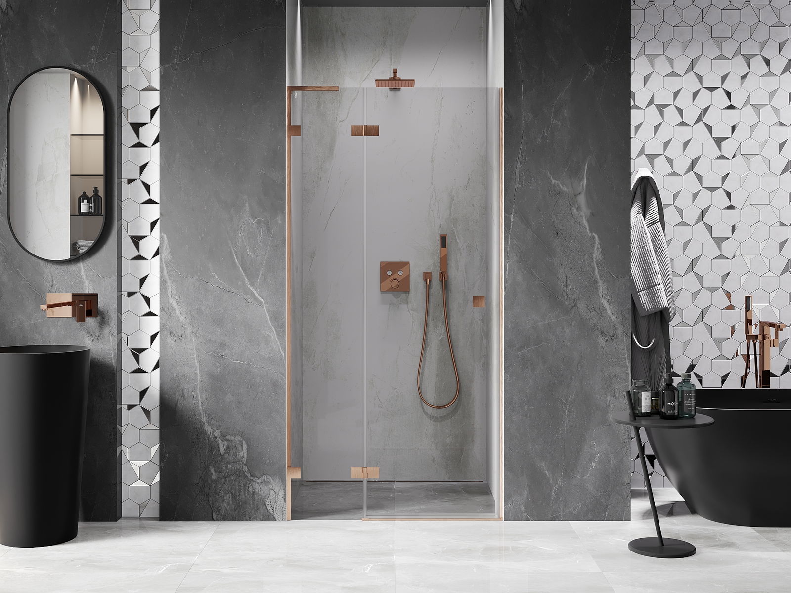L'impugnatura pratica e comoda è realizzata in metallo durevole e resistente. La forma alla moda combinata con una finitura abbinata al colore dei profili conferisce all'insieme un aspetto moderno e elegante, enfatizzando l'estetica di ogni bagno.