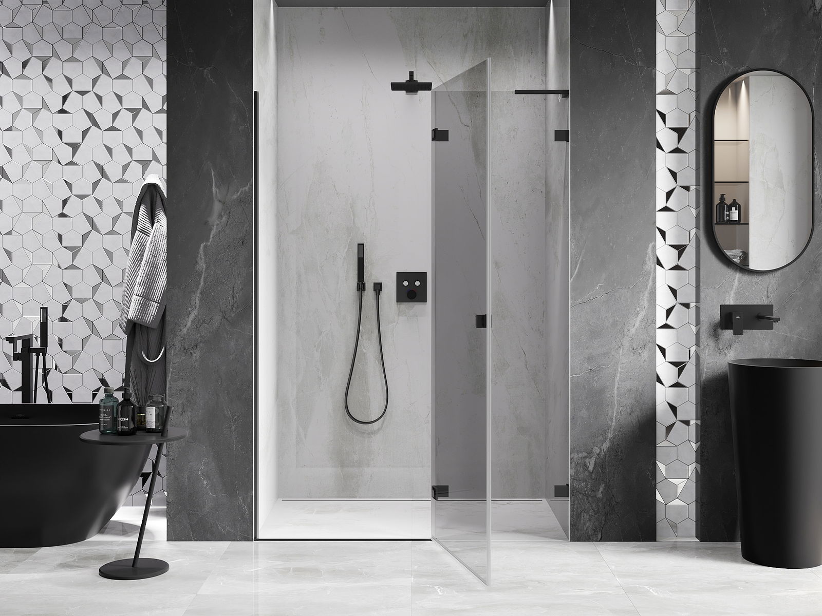 Il prodotto, a seconda delle esigenze, può essere installato sia sul piatto doccia che direttamente sul pavimento. Il metodo di installazione universale consente di adattare il prodotto a diversi tipi di bagni e configurazioni di spazio.