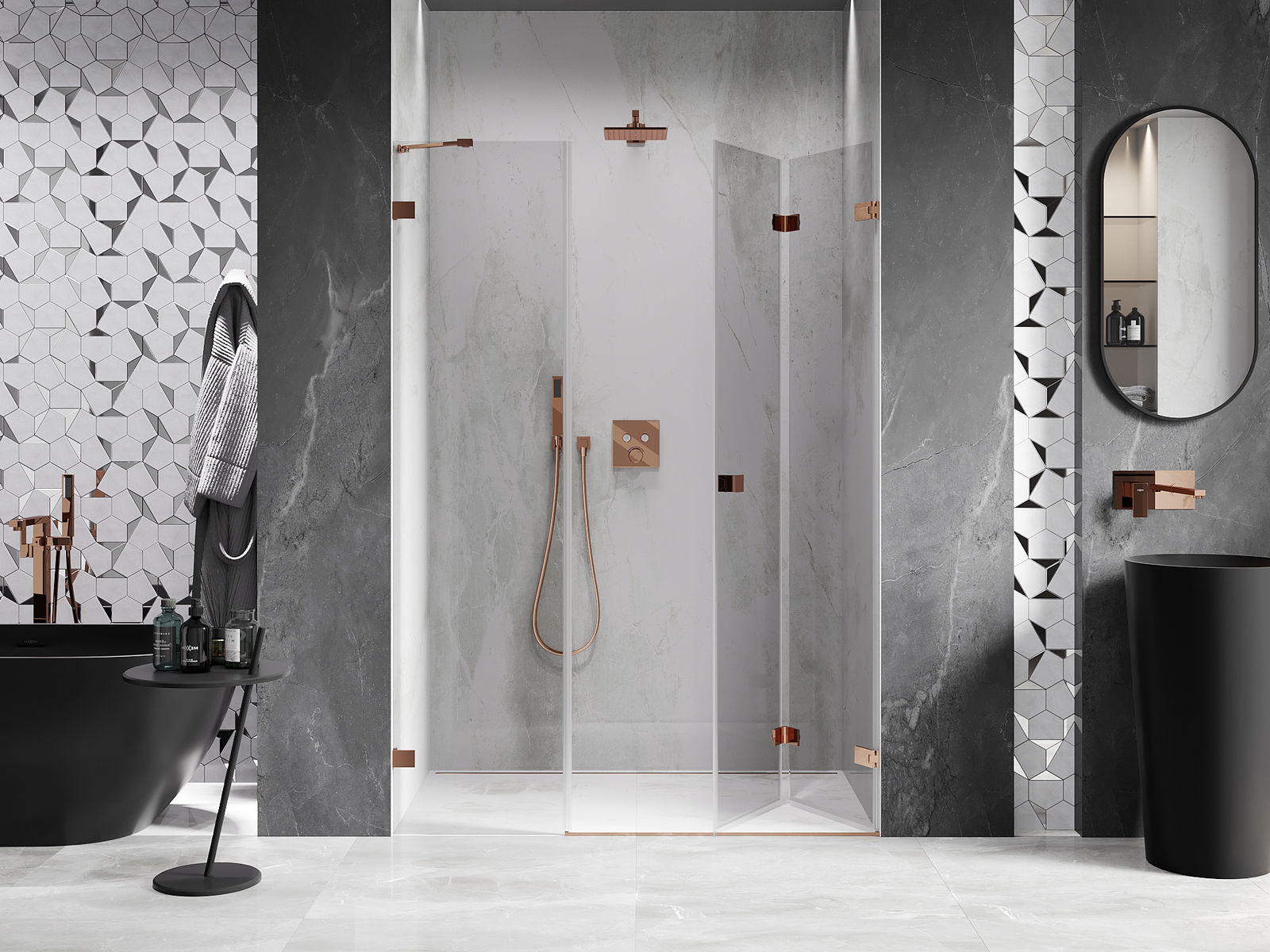 La possibilità di piegare le porte, sia verso l'esterno che verso l'interno, consente di ottenere più spazio quando la doccia non viene utilizzata. È una soluzione ideale per i bagni più piccoli, che sfrutta al massimo lo spazio disponibile.