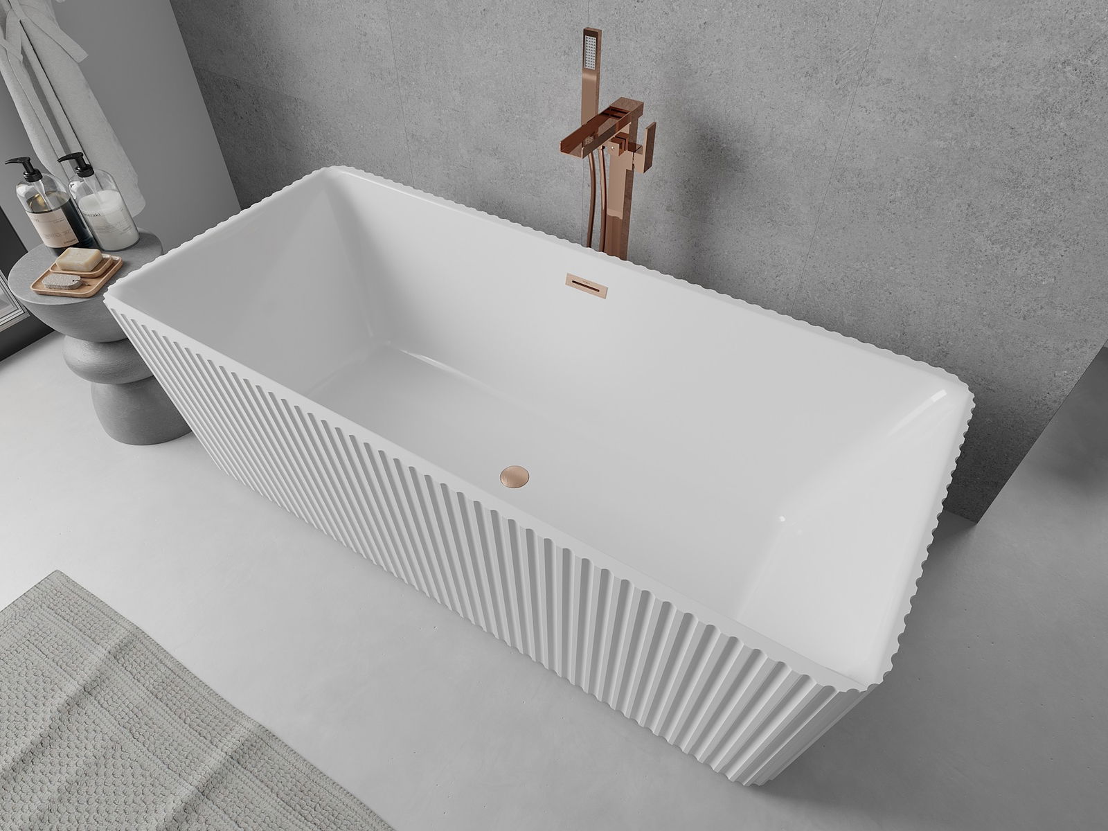 Mexen Nila vasca da bagno freestanding scanalata 170 x 75 cm, bianca, troppopieno in rame spazzolato - 52841708000-65