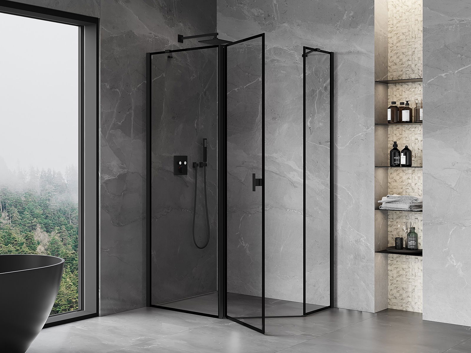 Mexen Mist cabina doccia pentagonale asimmetrica a battente sinistra 90 x 80 cm, cornice nera, nero - 8A8-090-080-70-70-L