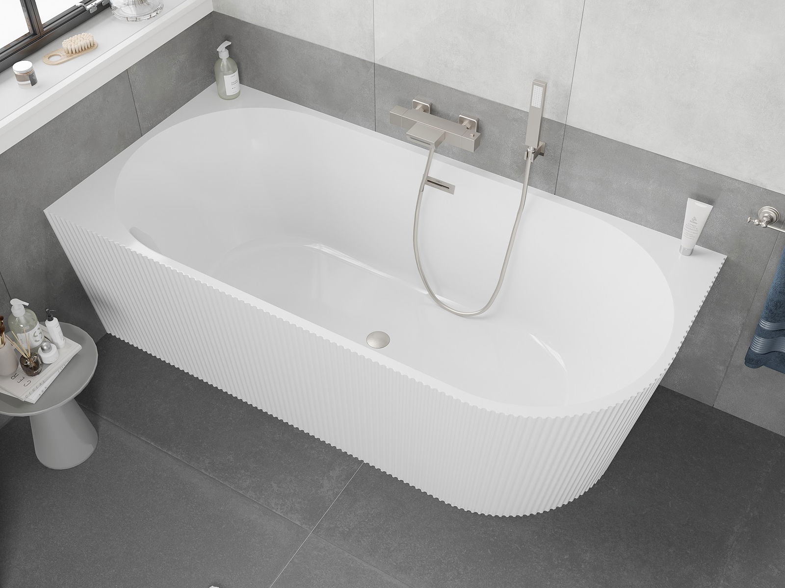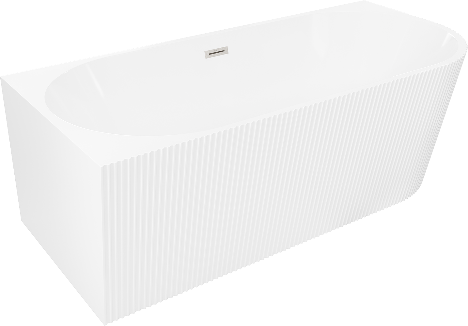 Mexen Silo vasca da bagno angolare autoportante sinistra scanalata 150 x 75 cm, bianca, troppopieno in nichel spazzolato