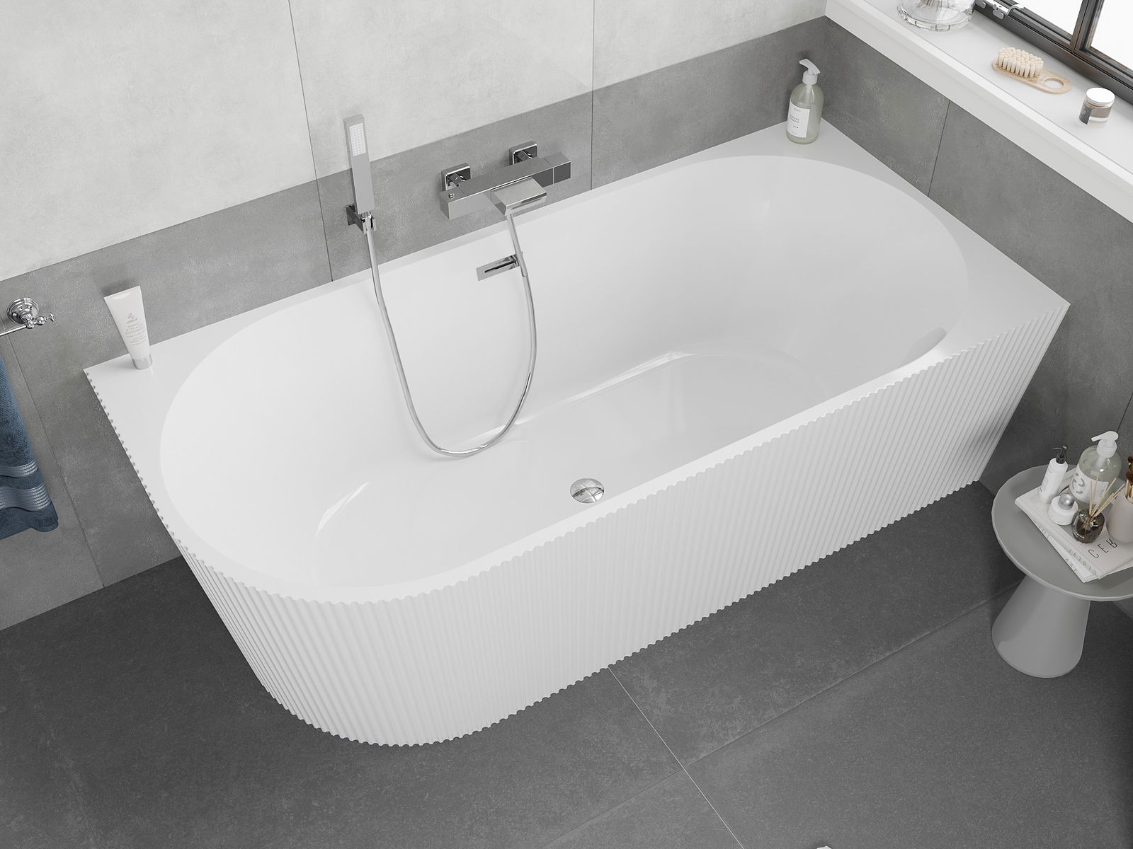 Mexen Silo vasca da bagno freestanding angolare destra rigata 150 x 75 cm, bianca, troppopieno cromato - 52891507500P-01
