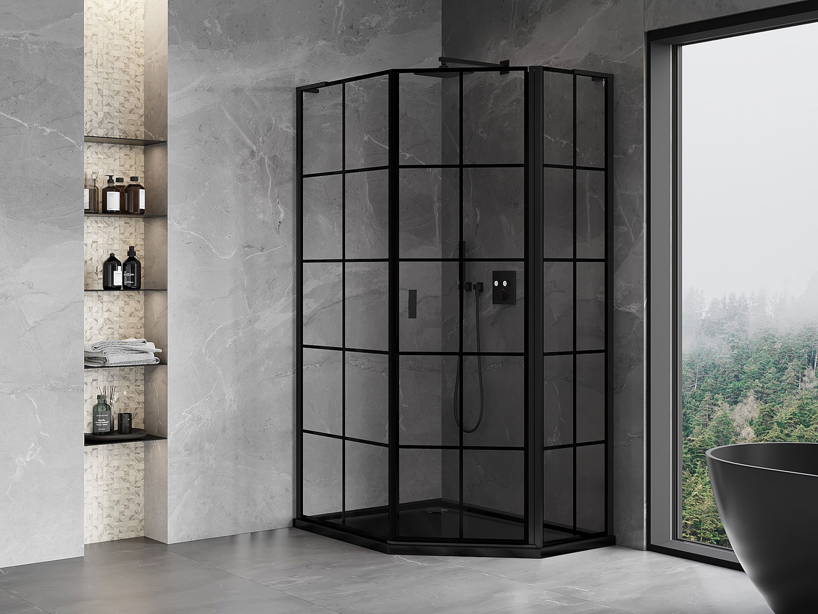 Mexen Mist L cabina doccia pentagonale asimmetrica battente destra 90 x 100 cm, griglia nera, nero - 8A8L-090-100-70-77-P