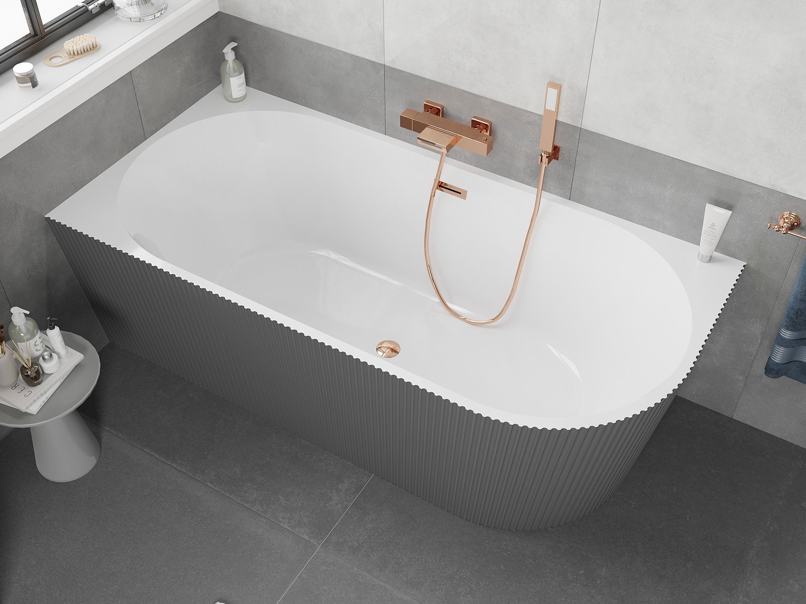 Mexen Silo vasca da bagno freestanding angolare sinistra scanalata 150 x 75 cm, bianca/grigia, troppo pieno oro rosa
