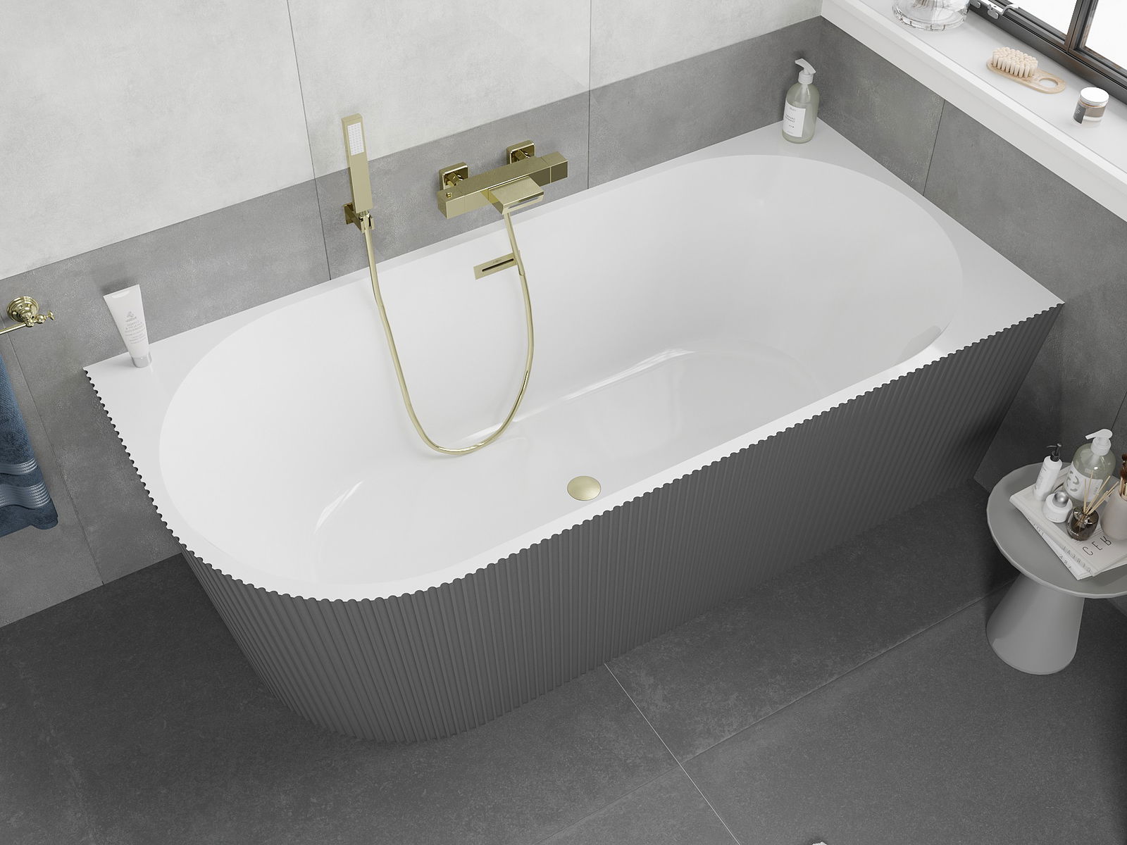 Mexen Silo vasca da bagno indipendente ad angolo destro zigrinata 150 x 75 cm, bianca/grigia, troppopieno oro spazzolato