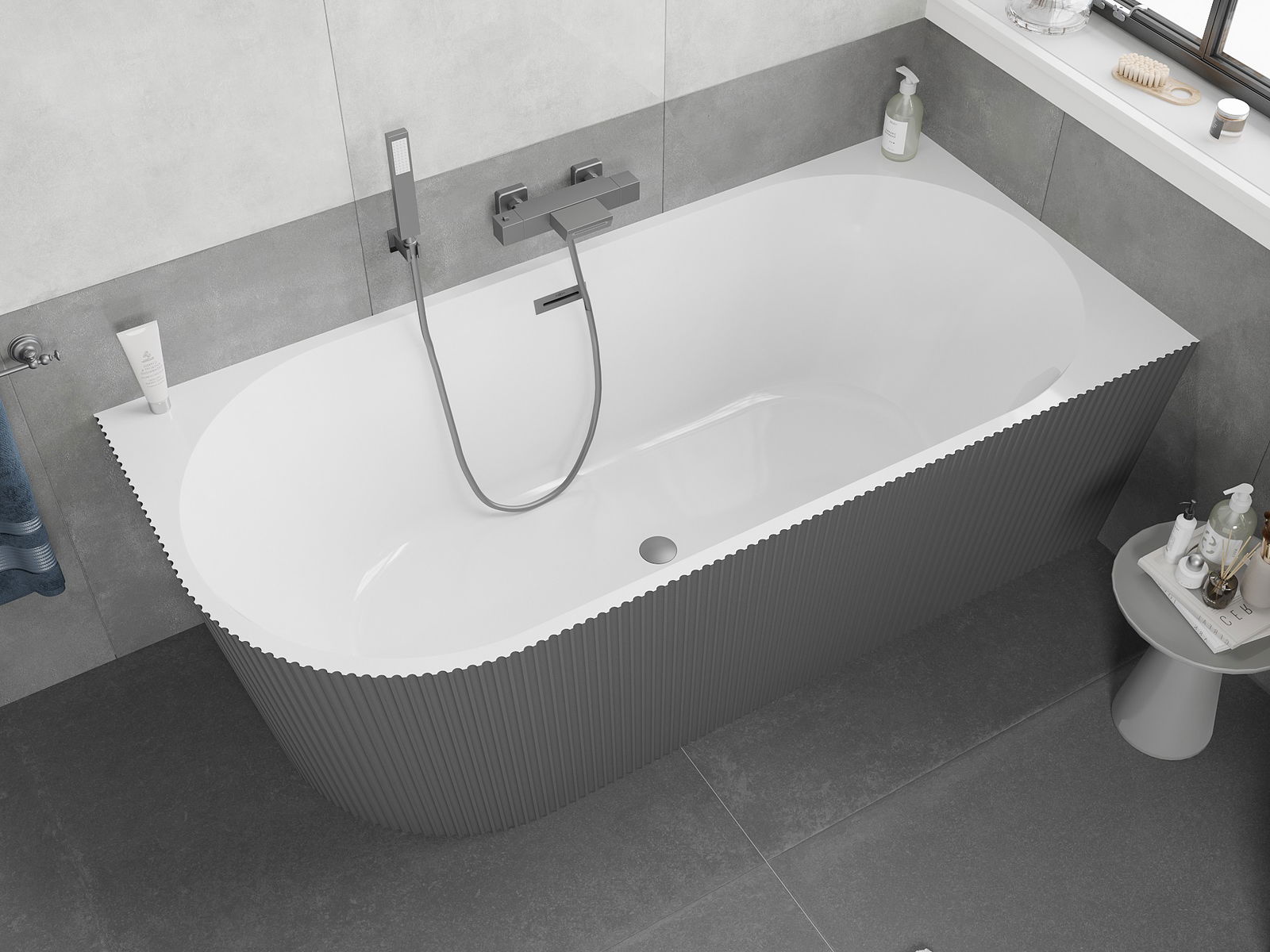 Mexen Silo vasca da bagno freestanding angolare destra scanalata 170 x 80 cm, bianca/grigia, troppopieno canna di fucile
