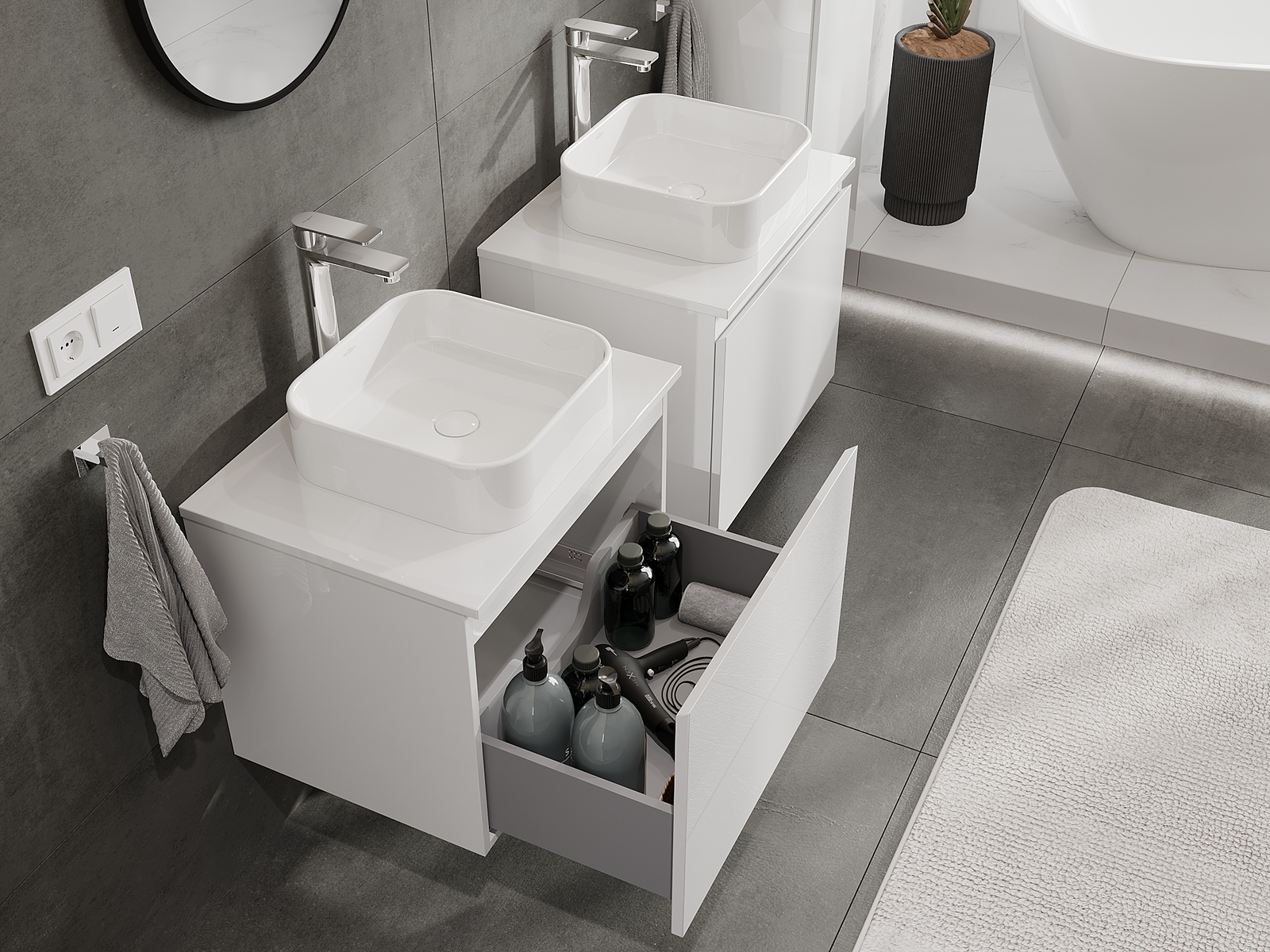 I nostri mobili da bagno modulari possono essere combinati tra loro in diverse configurazioni di colore, consentendo una personalizzazione completa. È possibile scegliere sia l'aspetto che le funzioni dei singoli elementi, permettendo di adattare i mobili alle proprie preferenze stilistiche e di utilizzo.