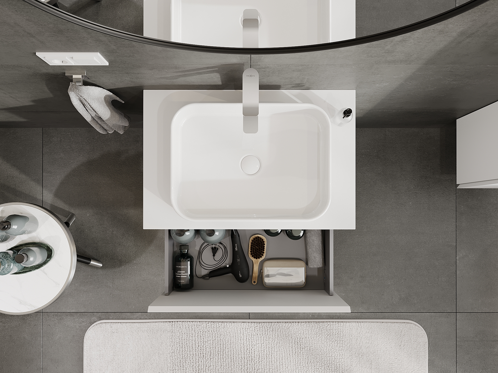 Il ritaglio nel cassetto è progettato in modo da ospitare il sifone, che è necessario nelle installazioni dei lavandini. Grazie a ciò, il mobile può essere montato in modo completamente funzionale, senza dover rinunciare allo spazio nel cassetto a favore dell'installazione.